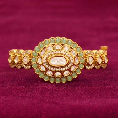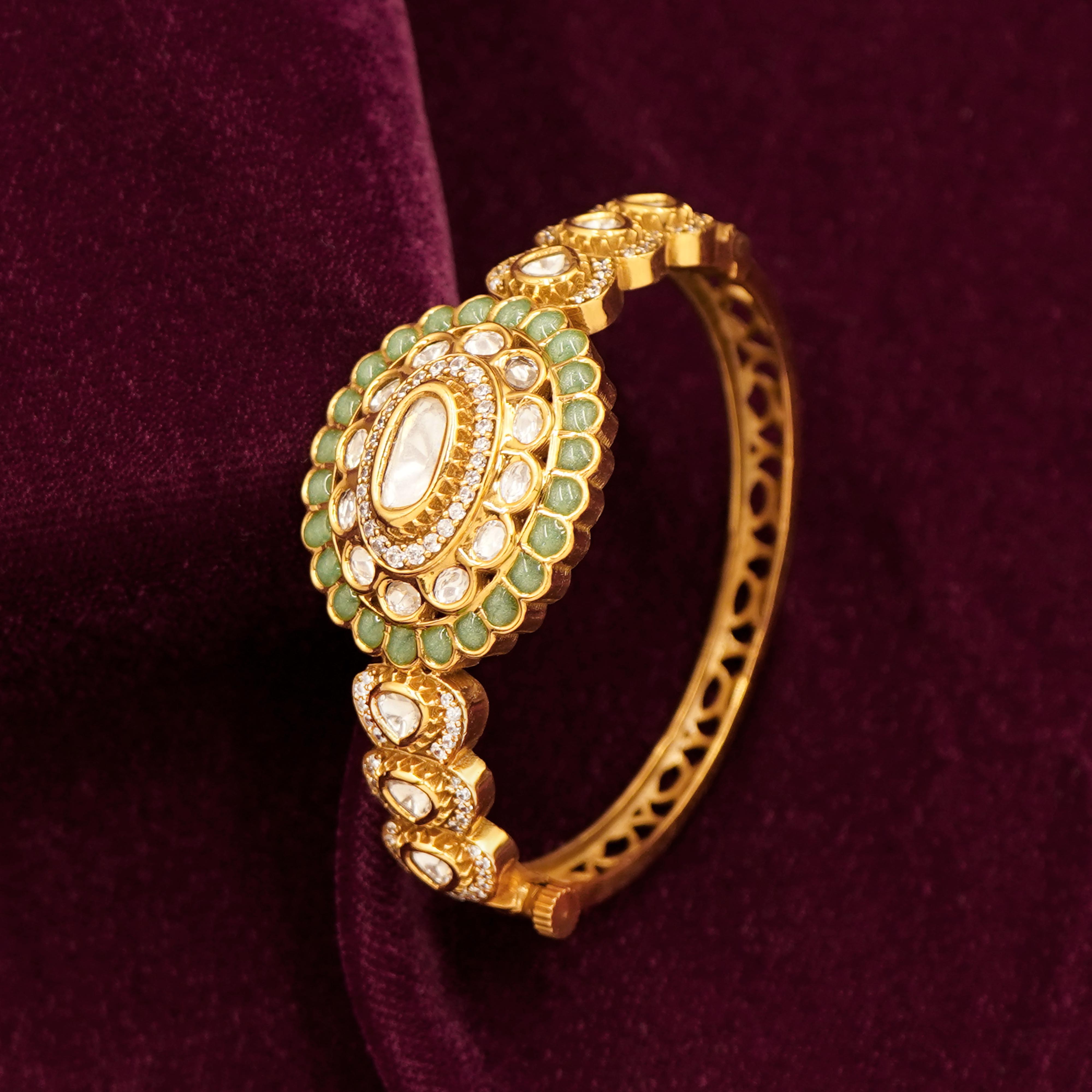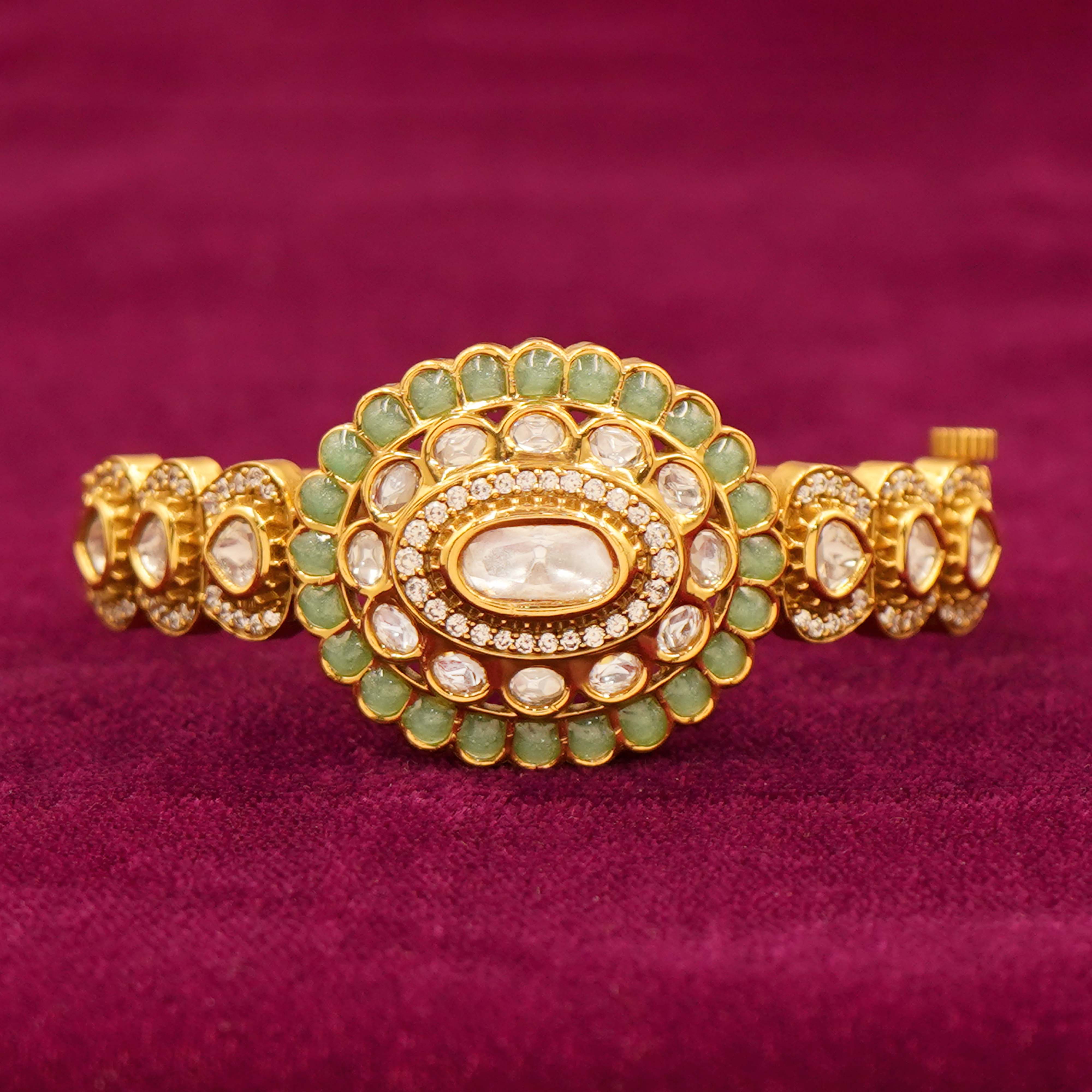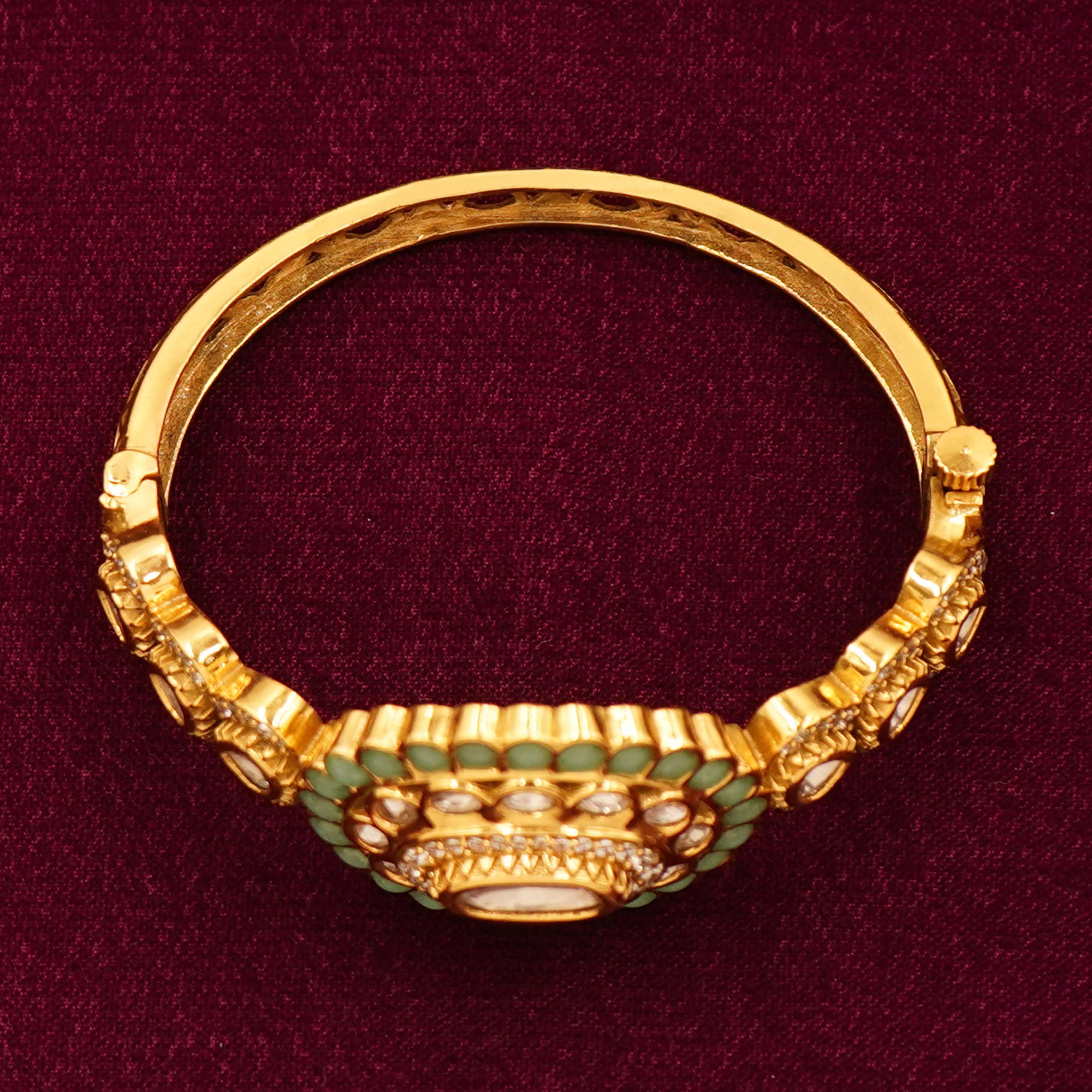 DESCRIPTION - Crafted in a high-quality gold-finish frame with intricate inner cutwork, this bangle is both durable and comfortable to wear. The secure openable clasp makes it perfect for brides, festive looks, weddings, and traditional celebrations. A timeless statement accessory that adds royal charm and sophistication to any ethnic outfit.