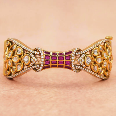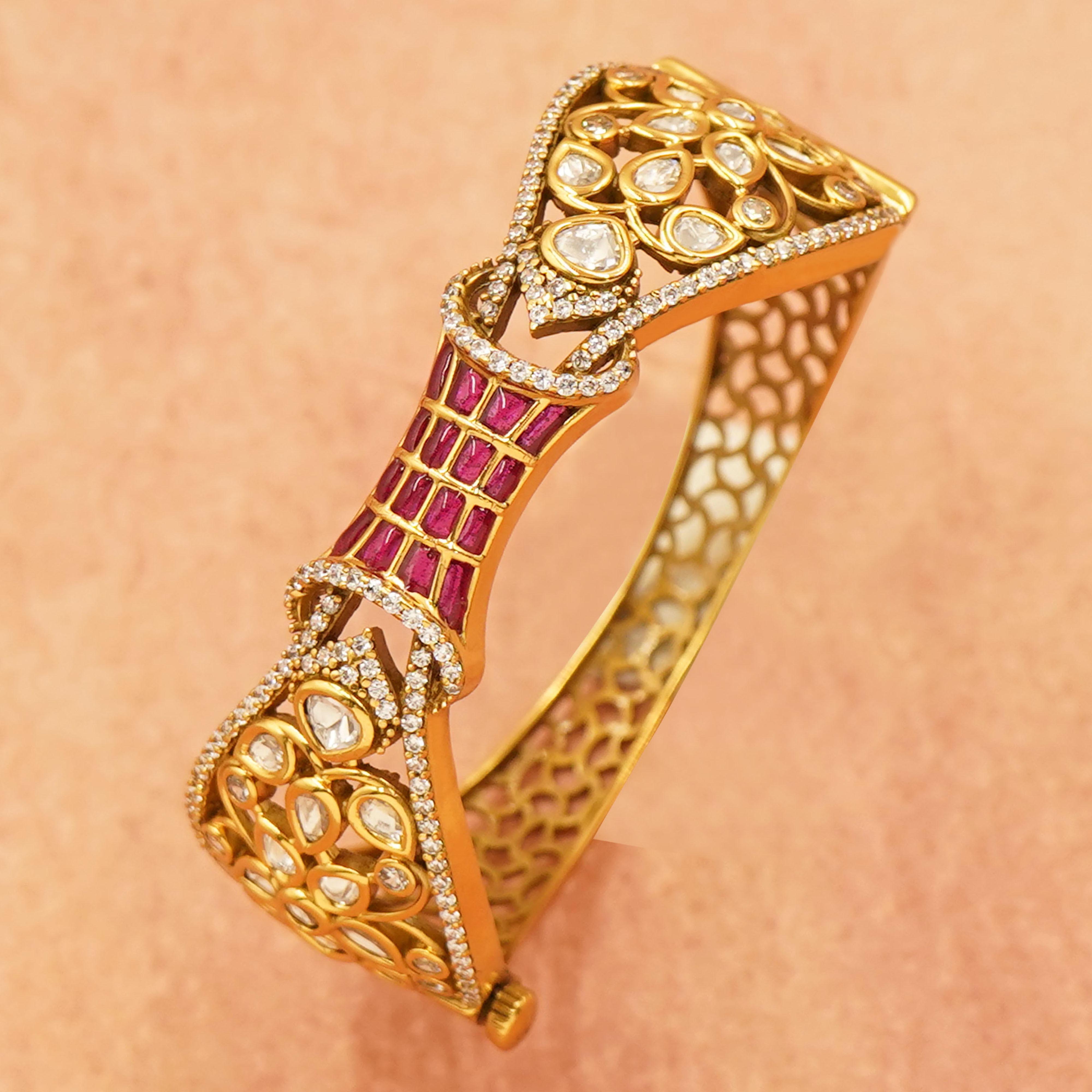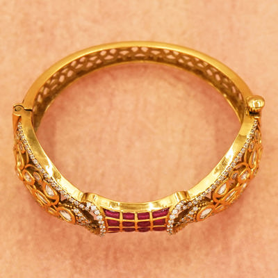 DESCRIPTION - Crafted in a premium gold-finish frame with a secure openable mechanism, this bangle is both stylish and comfortable to wear. Perfect for weddings, bridal trousseaus, festive occasions, and grand traditional looks, this statement piece adds a regal charm to any outfit.