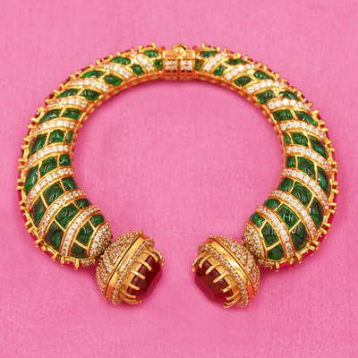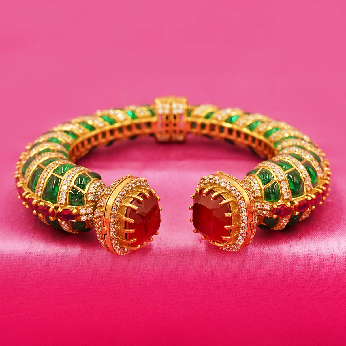 DESCRIPTION - Make a bold and royal statement with this exquisite designer bangle, featuring a stunning combination of deep red ruby-style center stones and rich emerald-green detailing. The bangle is crafted with a premium gold-finish framework, adorned with fine shimmering accents that enhance its grandeur.