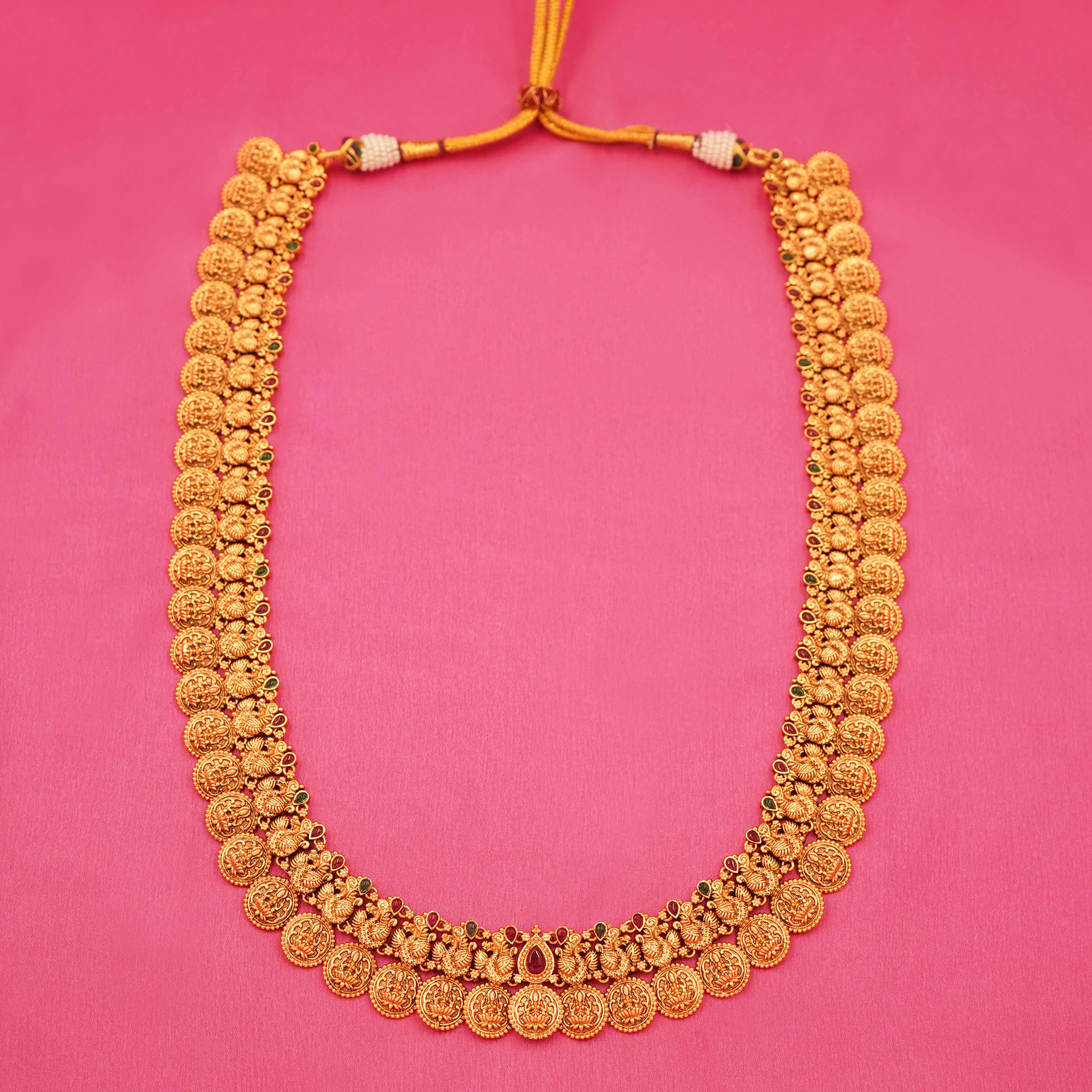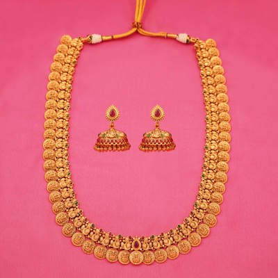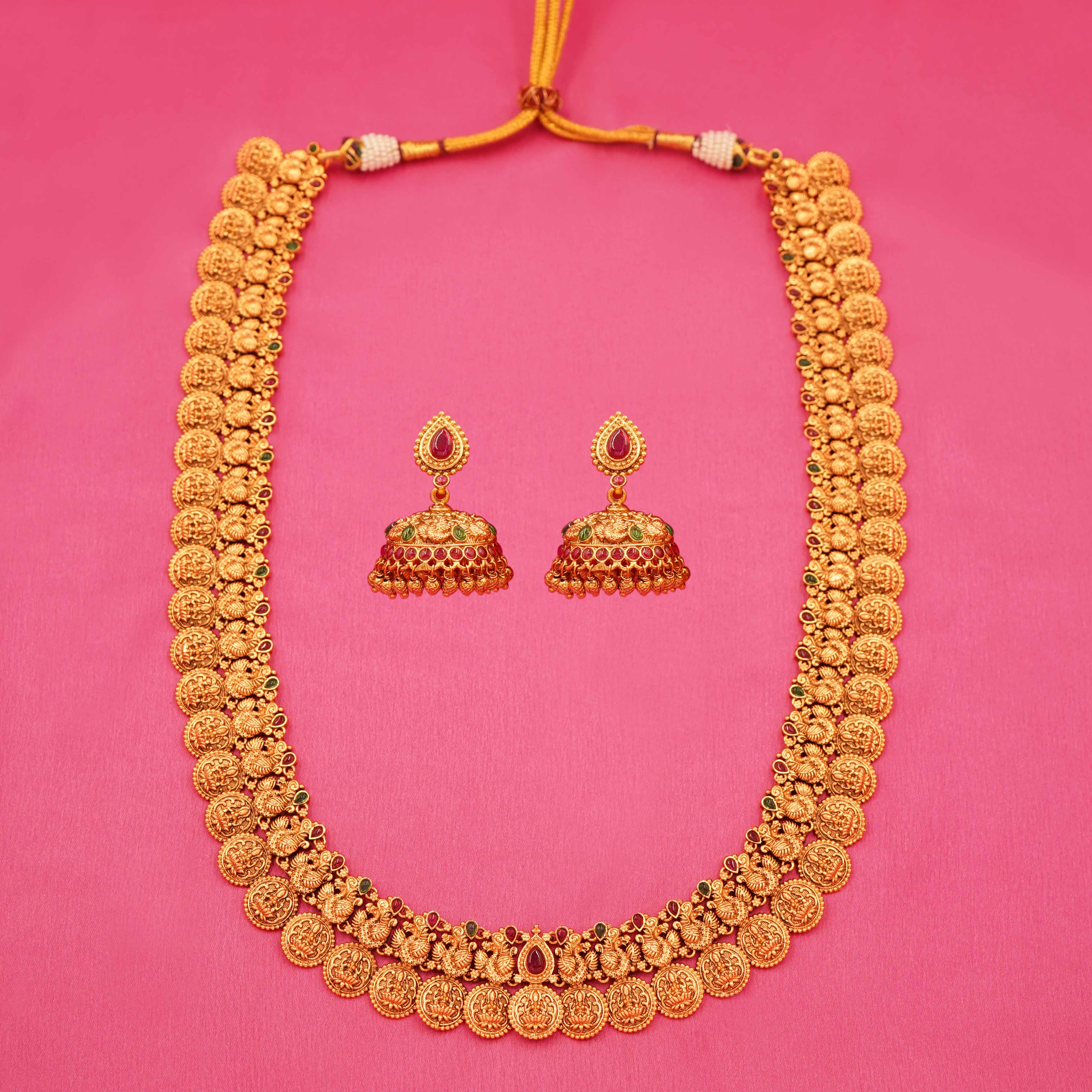Maharani Adorn: Regal Gold-Tone Long Necklace Set with Coordinated Earrings