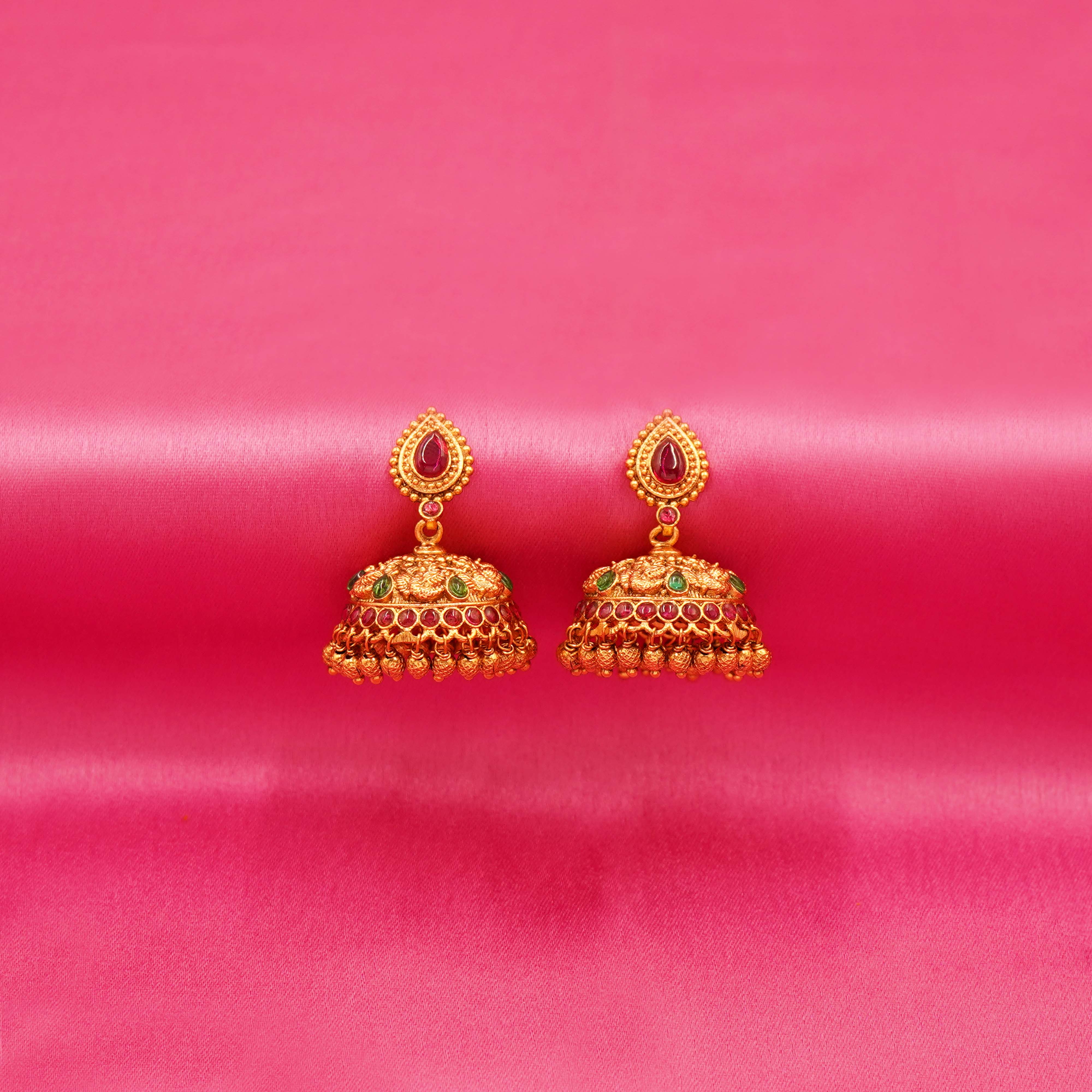 DESCRIPTION - LONG NECKLACE SET/ NECKLACE SET, Regal Gold-tone Metal Necklace and Earrings Set TRADITIONAL INDIAN JEWELLERY SET CONSISTING OF A NECKLACE AND A PAIR OF JHUMKA-STYLE EARRINGS. THE DESIGN APPEARS TO BE INSPIRED BY TEMPLE JEWELLERY, OFTEN CHARACTERIZED BY INTRICATE GOLD WORK AND EMBELLISHMENTS WITH RED, GREEN, AND PURPLE STONES.