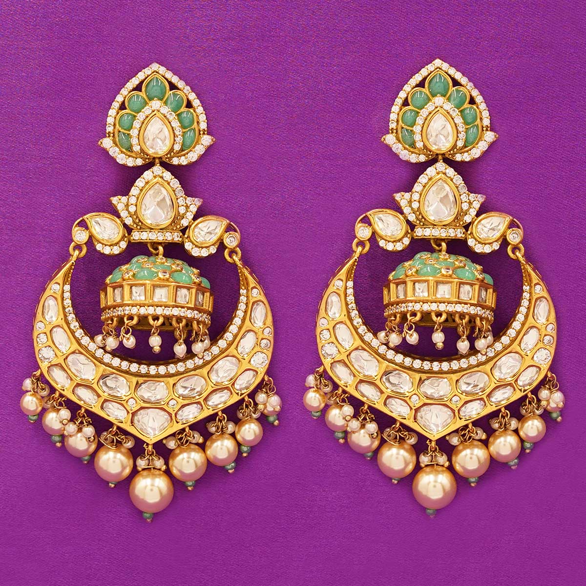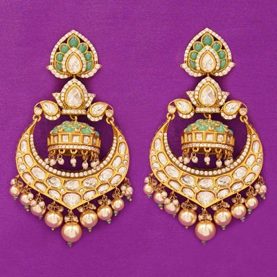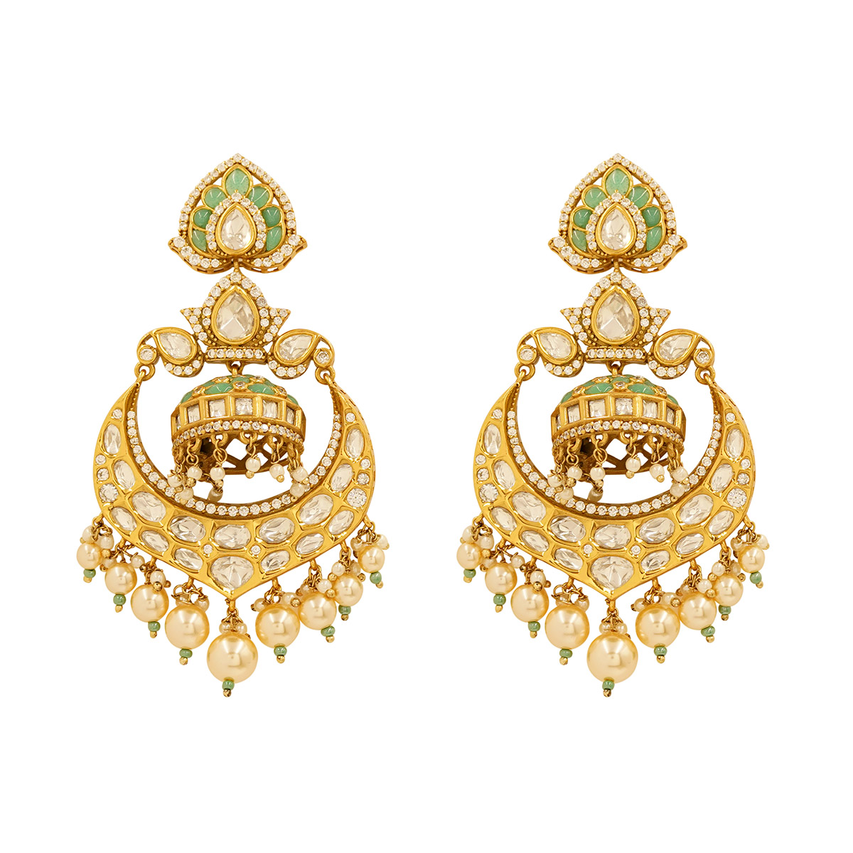 DESCRIPTION - These elegant chandbali earrings feature soft mint-green stones combined with sparkling Kundan work for a rich, traditional look. The intricate detailing and pearl droplets add graceful movement and festive charm. Perfect for weddings, receptions, and ethnic outfits, giving you a royal and timeless appeal