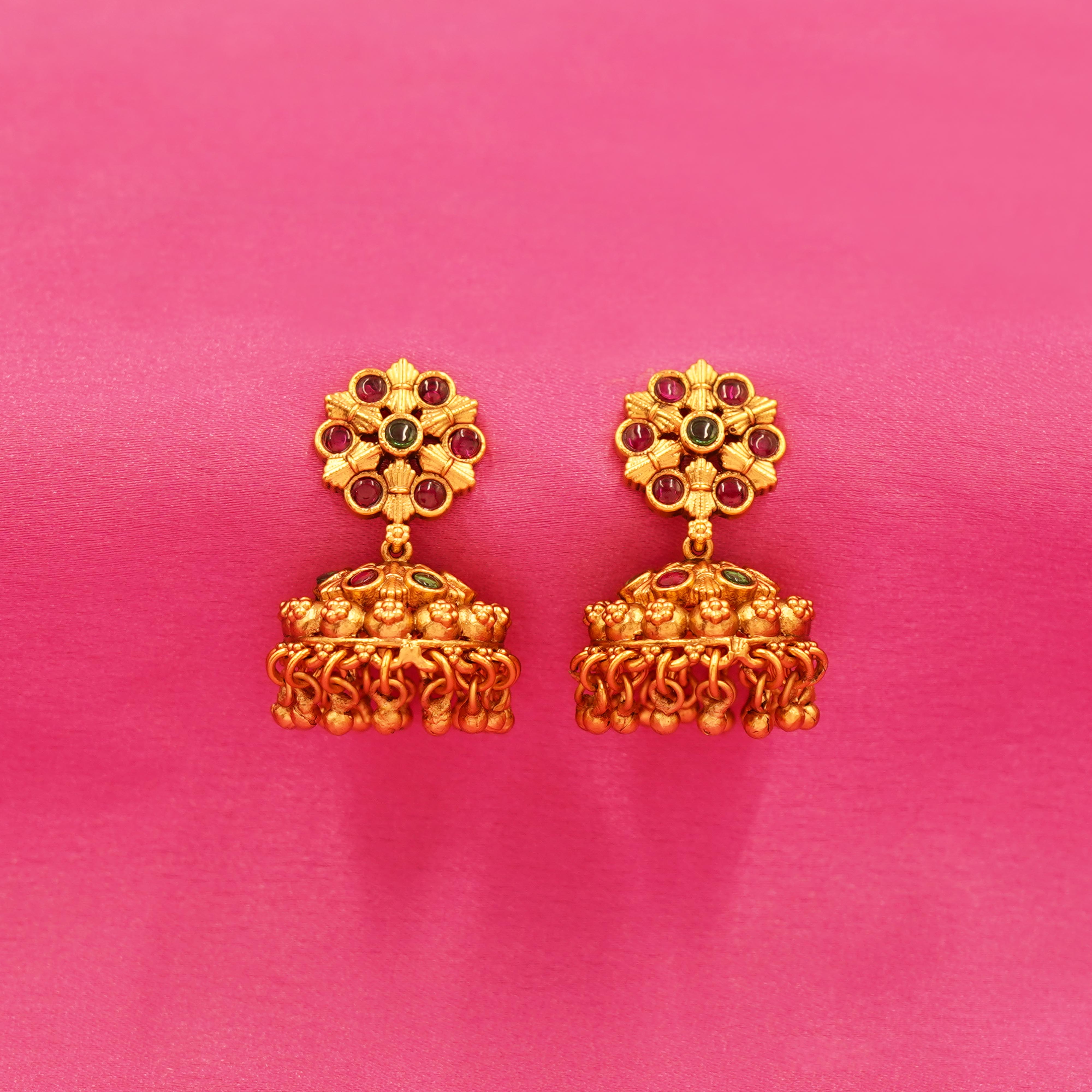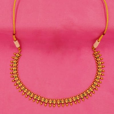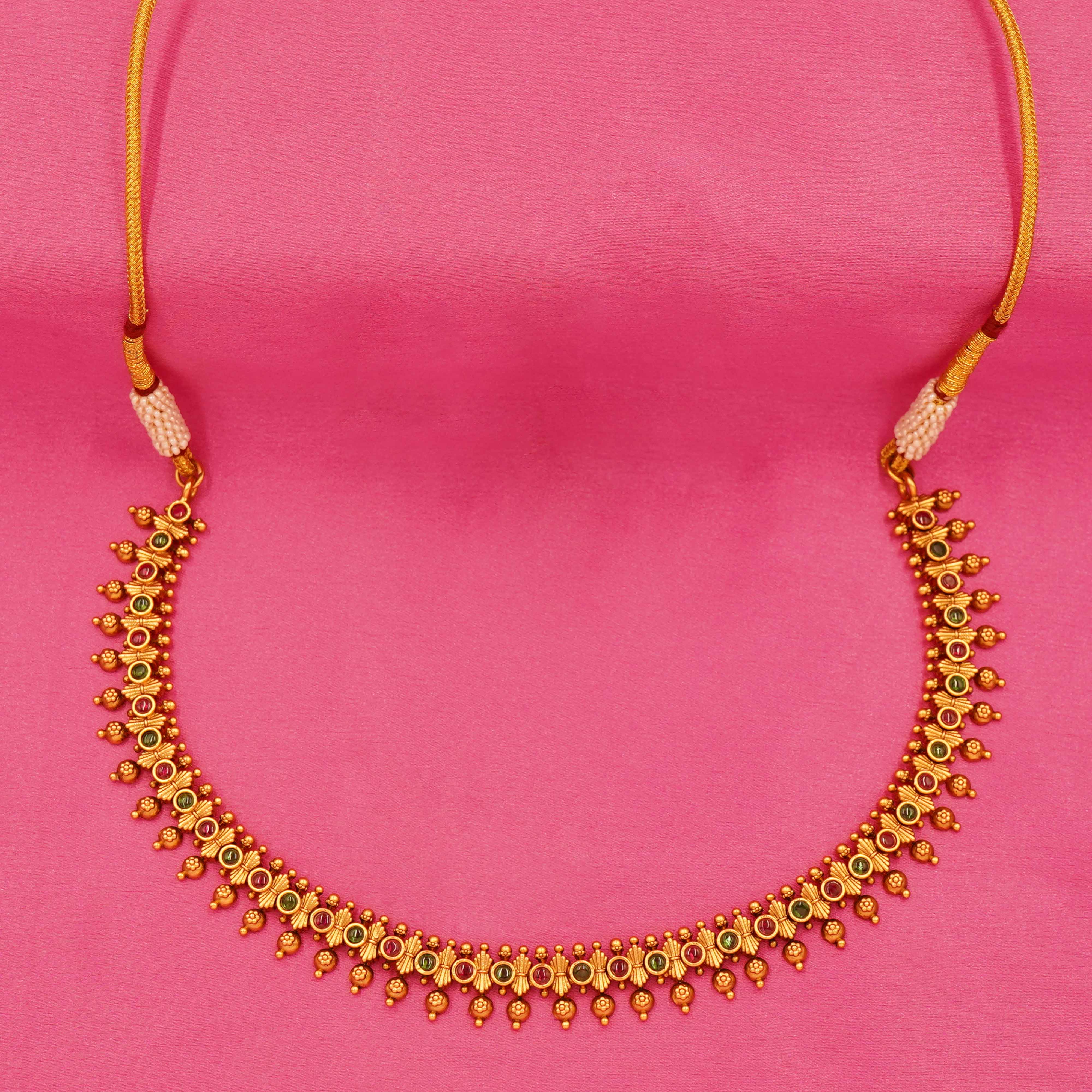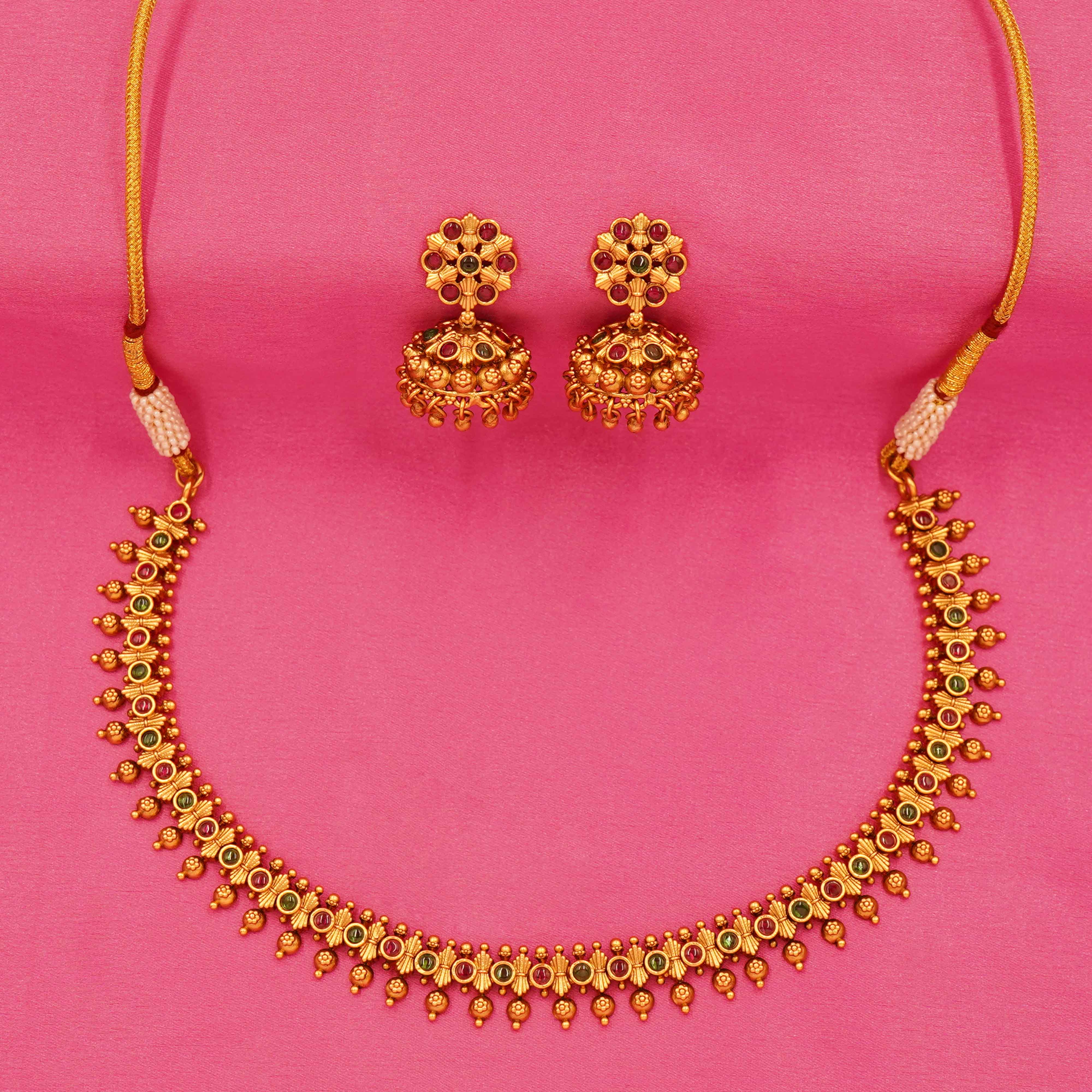 DESCRIPTION - NECKLACE SET/SHORT NECKLACE/CHOCKER, Majestic Gold-tone Metal Necklace and Earrings Set A magnificent celebration of traditional artistry, this gold-tone metal necklace and earrings set embodies regal charm and cultural significance. The necklace features alternating red and green gemstones