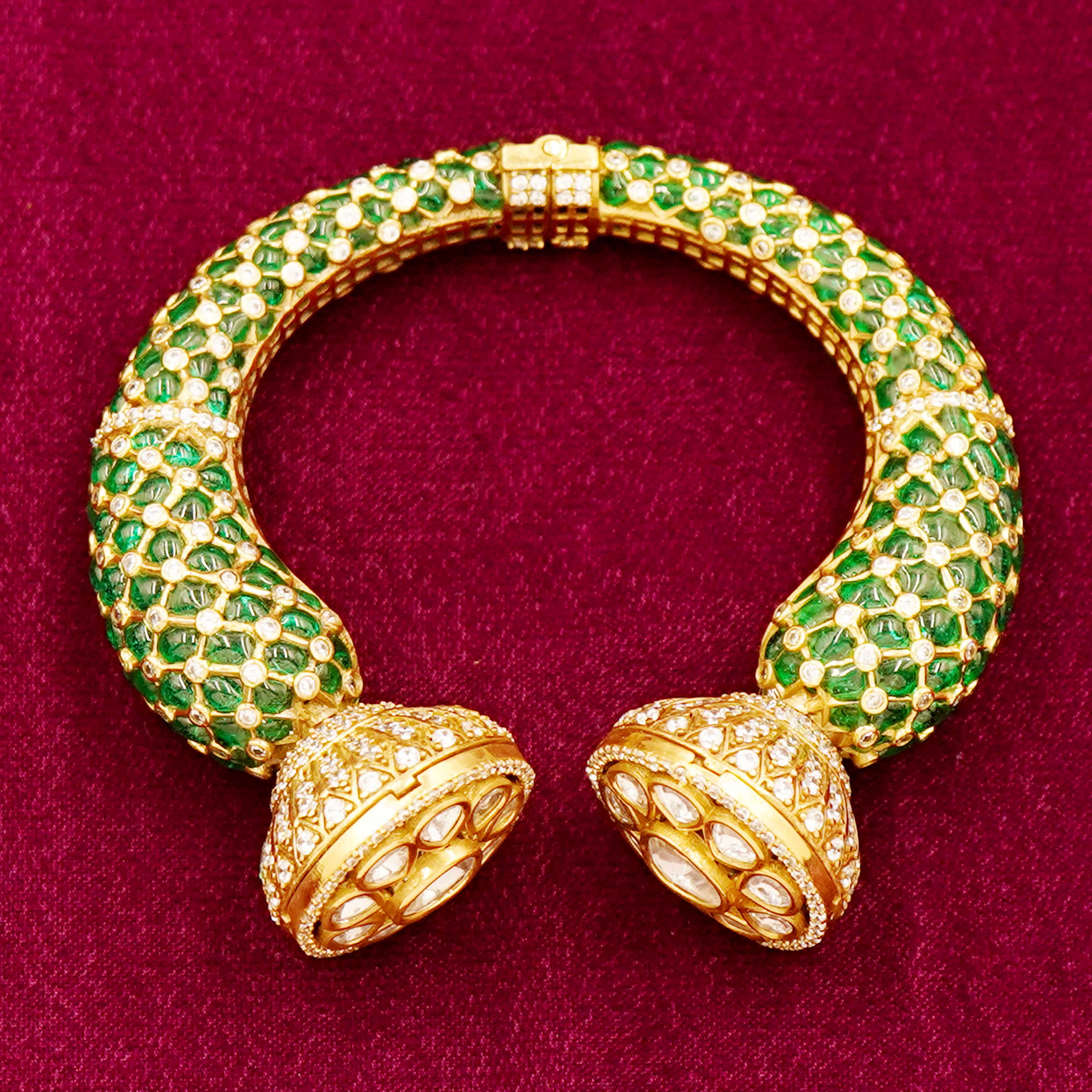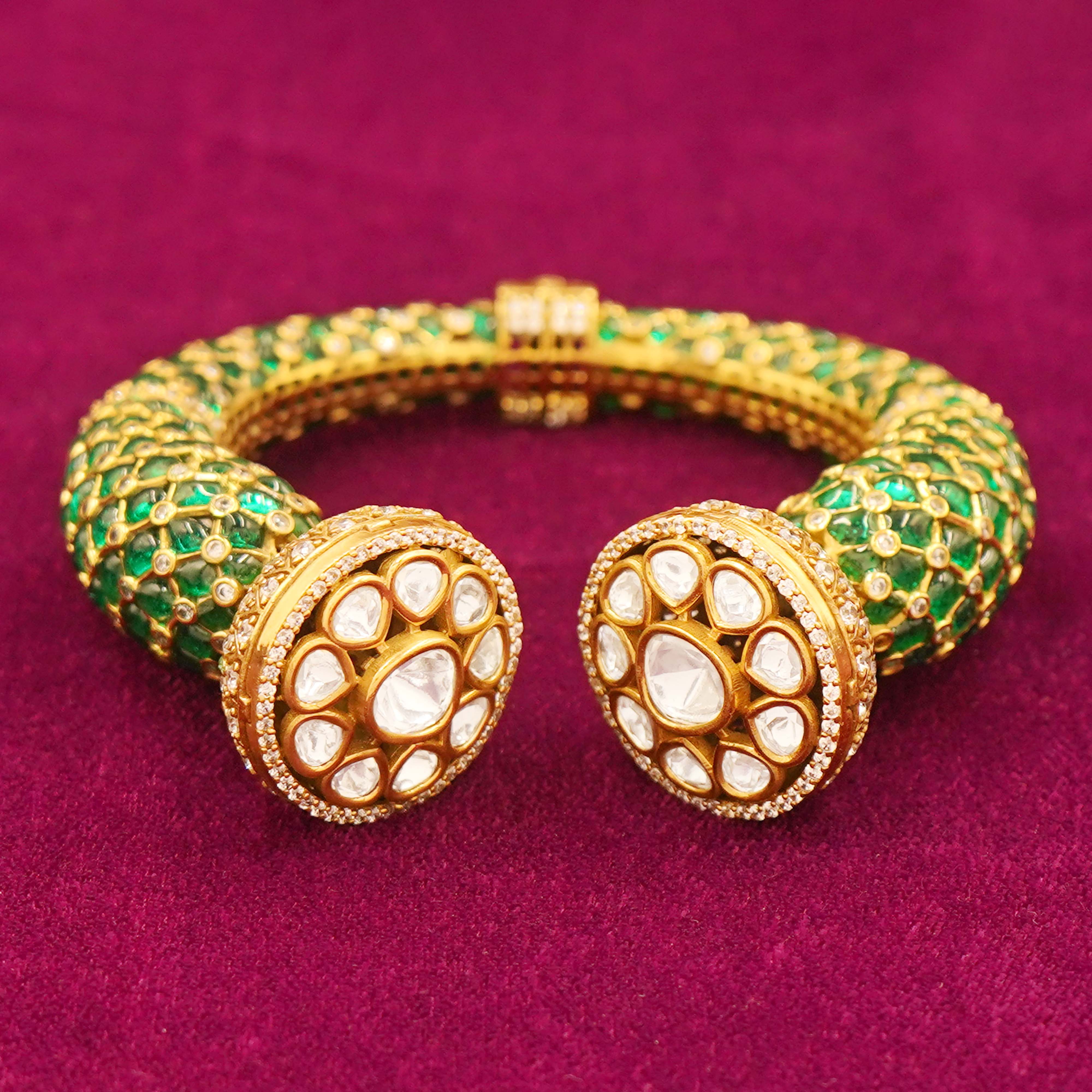 DESCRIPTION - The bangle’s curved design is adorned with intricate meenakari patterns and delicate stonework, giving it an opulent and heritage-inspired look. Crafted in a premium gold-finish frame with a secure openable clasp, it ensures both elegance and comfort.