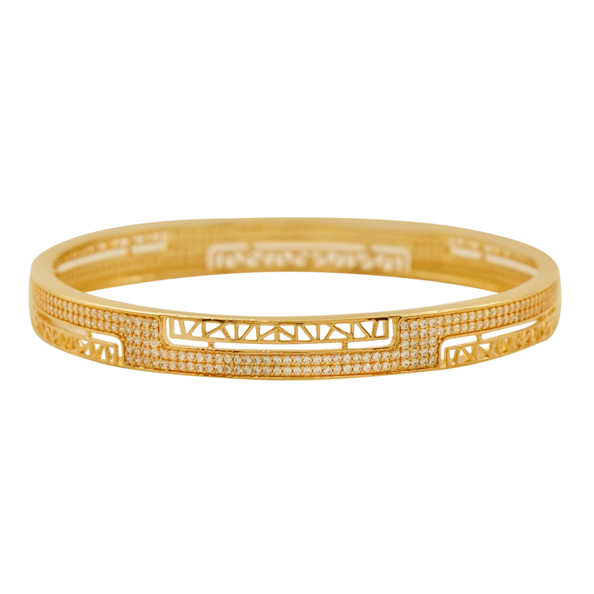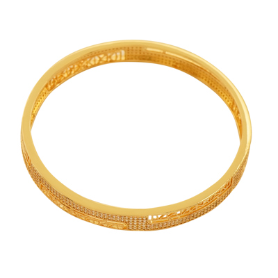 DESCRIPTION - This stylish bangle pair features a sleek, modern design with intricate cutwork patterns and finely studded stones that add a rich sparkle. Finished in a high-quality gold-tone (not real gold), these bangles are lightweight, durable, and perfect for elevating both festive and everyday looks.