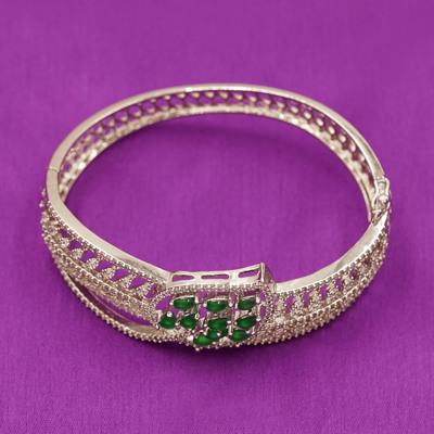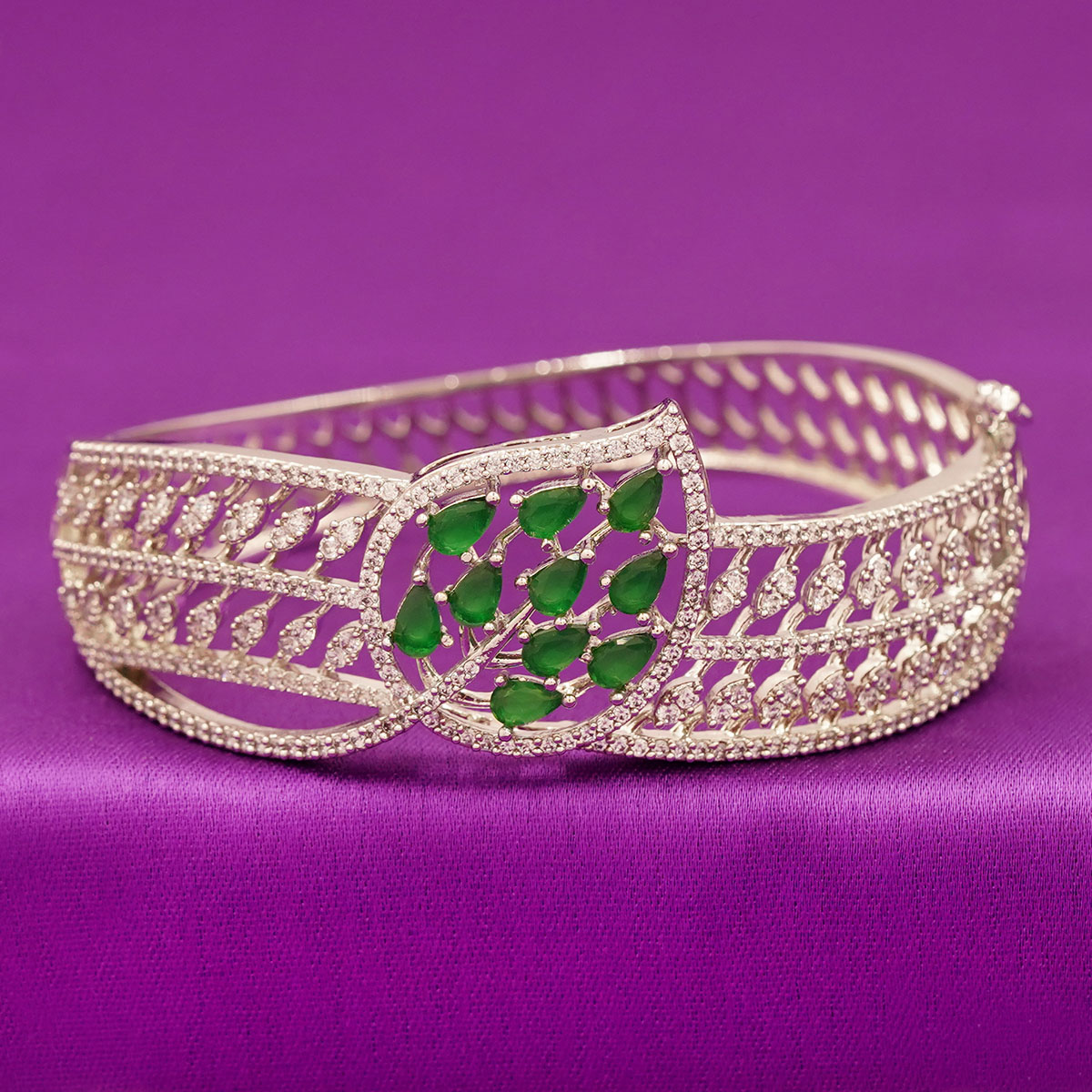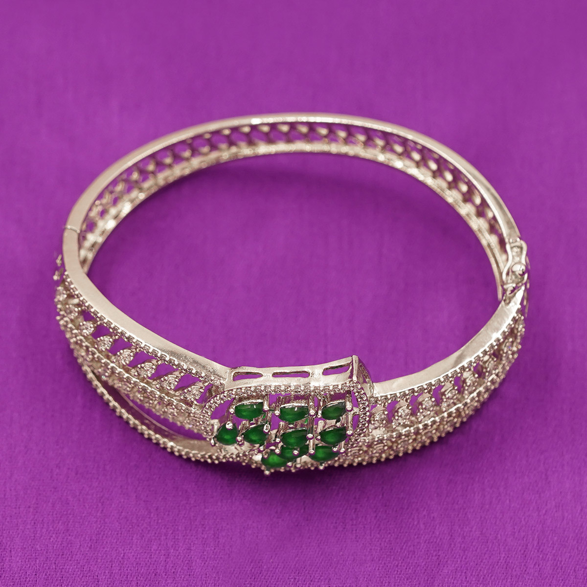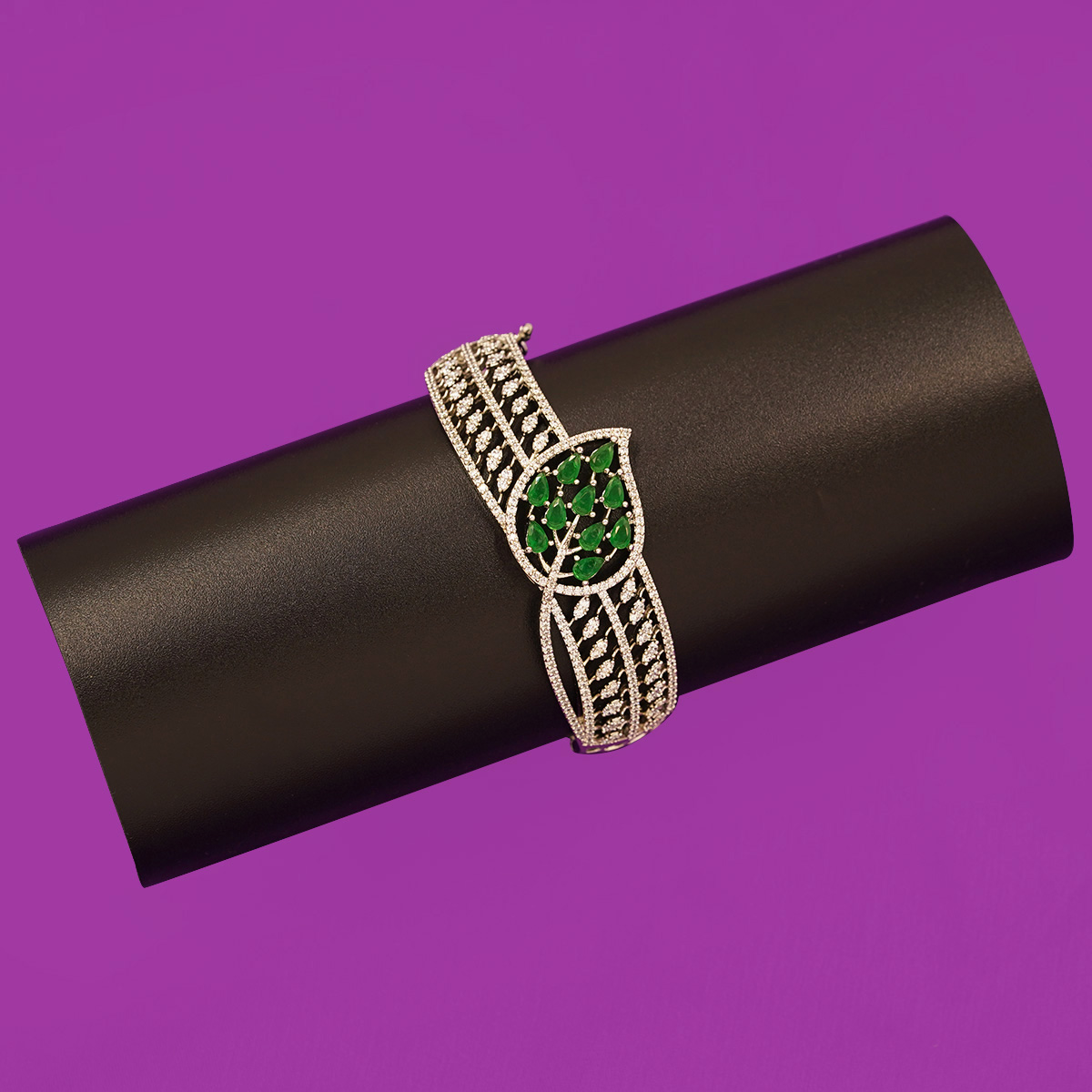 DESCRIPTION - This elegant designer kada features a beautifully crafted leaf motif highlighted with vibrant green teardrop stones. Made with a premium metal finish, this kada combines modern elegance with traditional charm, making it perfect for weddings, festive wear, parties, and special occasions. Lightweight yet statement-worthy, it elevates any ethnic or Indo-western outfit effortlessly.