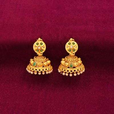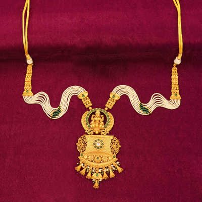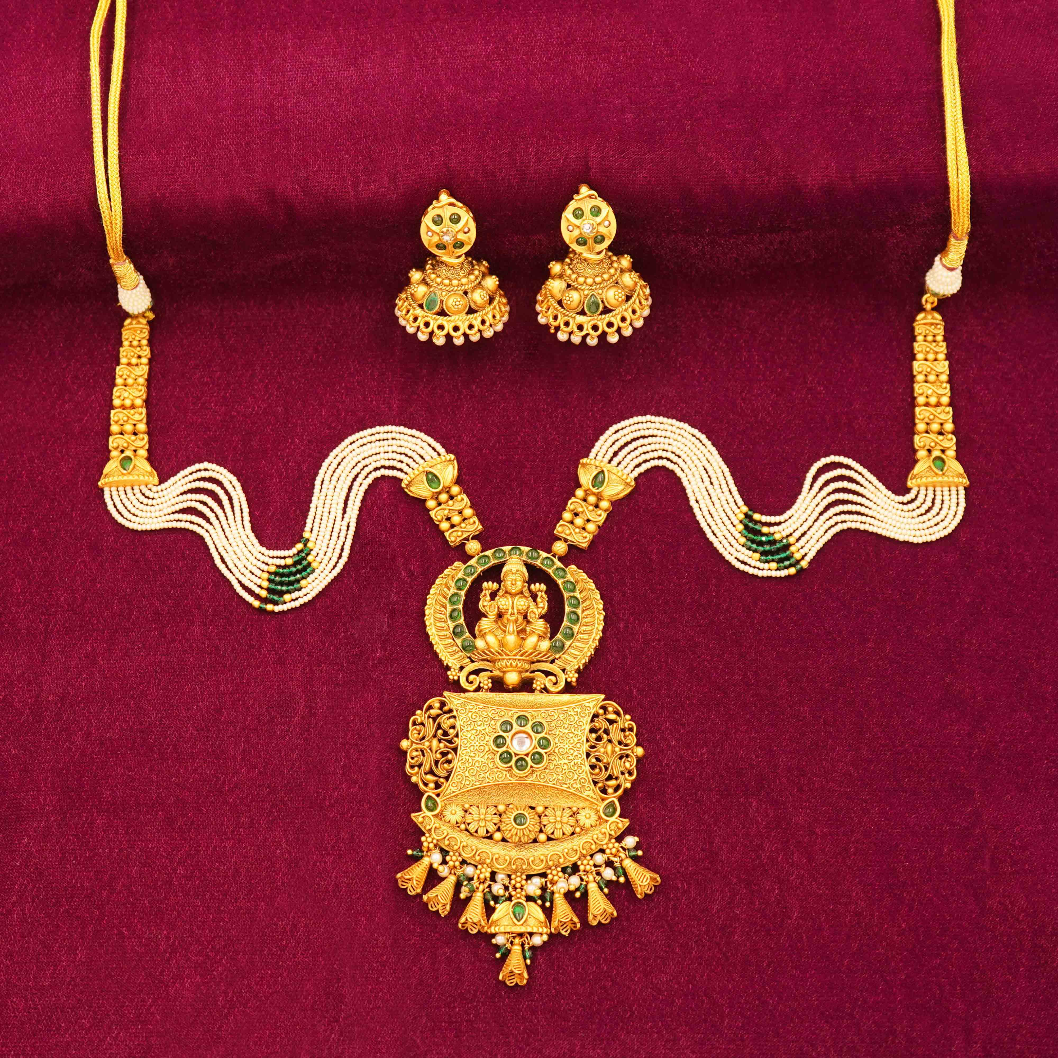 DESCRIPTION - ANTIQUE NECKLACE, THE NECKLACE FEATURES MULTIPLE STRANDS OF DELICATE WHITE PEARLS, PUNCTUATED BY GREEN STONE ACCENTS.A regal Jaipuri-inspired temple jewelry set, featuring an intricately crafted deity pendant adorned with green accents and detailed filigree work. this piece reflects timeless artistry and royal elegance.