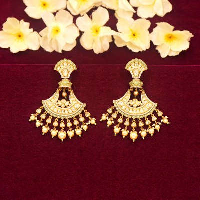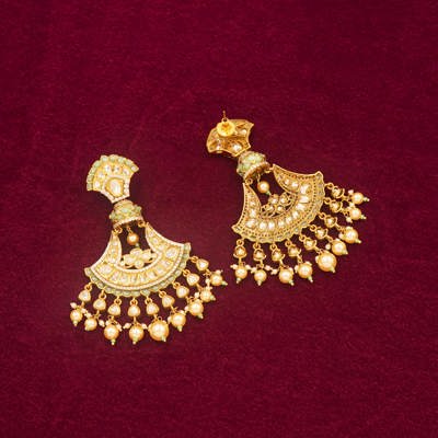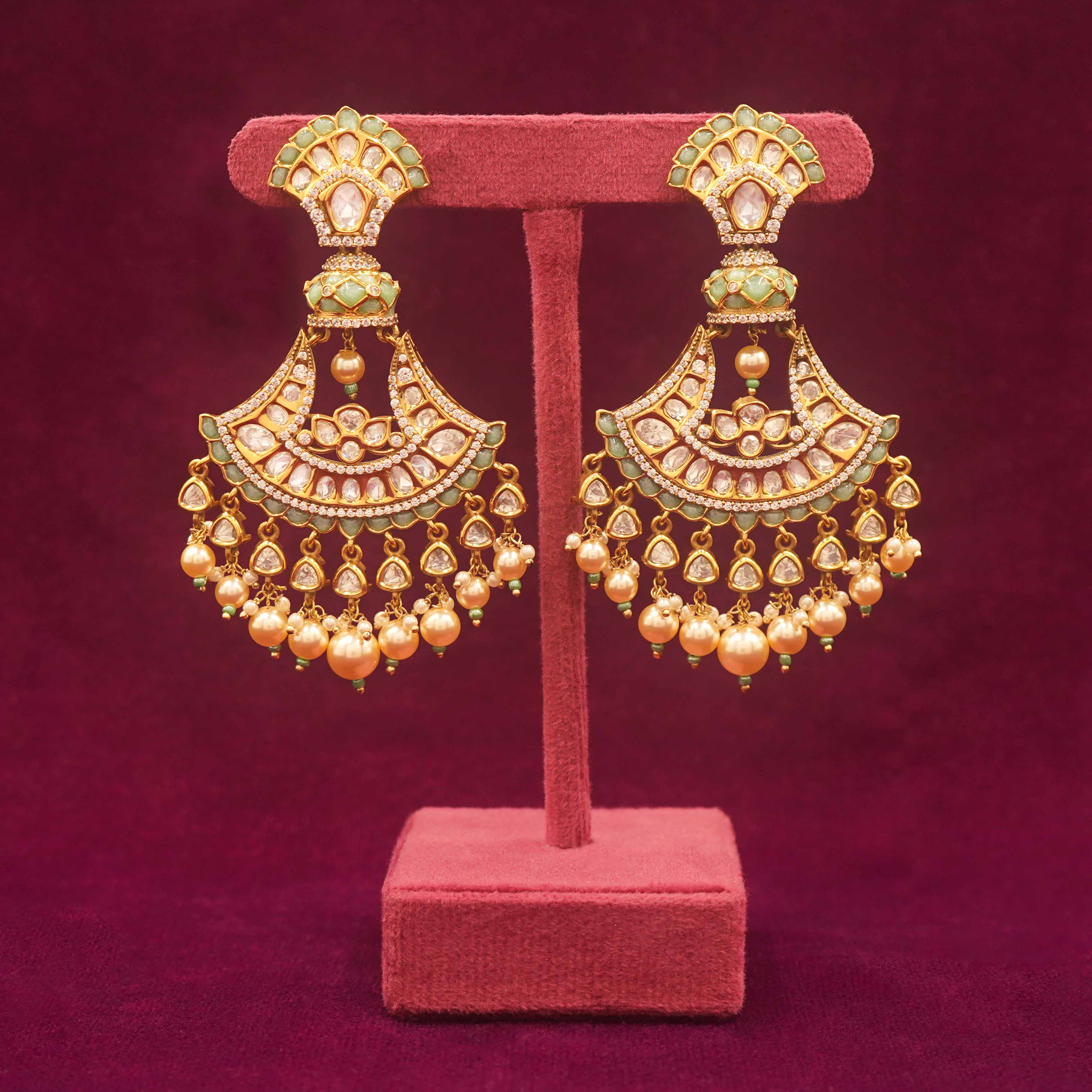 DESCRIPTION - Kundan Earring / Earring / Elegant Mint Kundan Chandbali Earrings Make a grand statement with these mint green and champagne-toned chandbali earrings, designed in an exquisite fan-shaped silhouette. Cascading layers of pearl-like beads add a graceful sway to every movement, making them perfect for weddings, festive occasions, or ethnic celebrations.