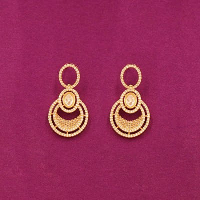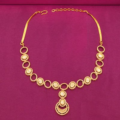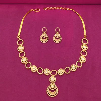 DESCRIPTION - ZIRCON NECKLACE/NECKLACE SET, THE NECKLACE IS AN ELEGANT GOLD-PLATED NECKLACE AND EARRING SET, LIKELY DESIGNED FOR FORMAL OR TRADITIONAL OCCASIONS. THE NECKLACE FEATURES ALTERNATING OVAL AND CIRCULAR LINKS ENCRUSTED WITH ZIRCON, LEADING TO A LARGER, INTRICATE PENDANT AT THE CENTER. THE MATCHING EARRINGS MIRROR THE PENDANT'S DESIGN, WITH CONCENTRIC CIRCLES AND A CENTRAL OVAL STONE.