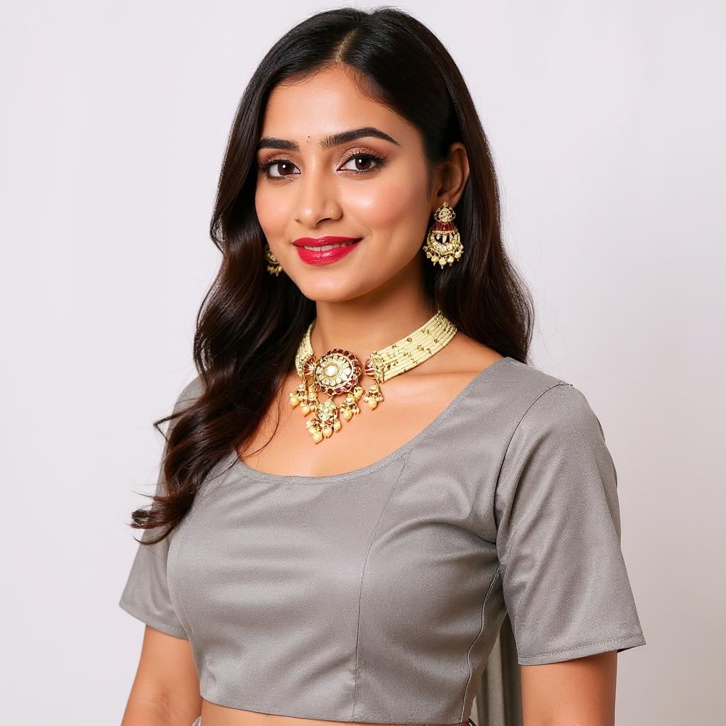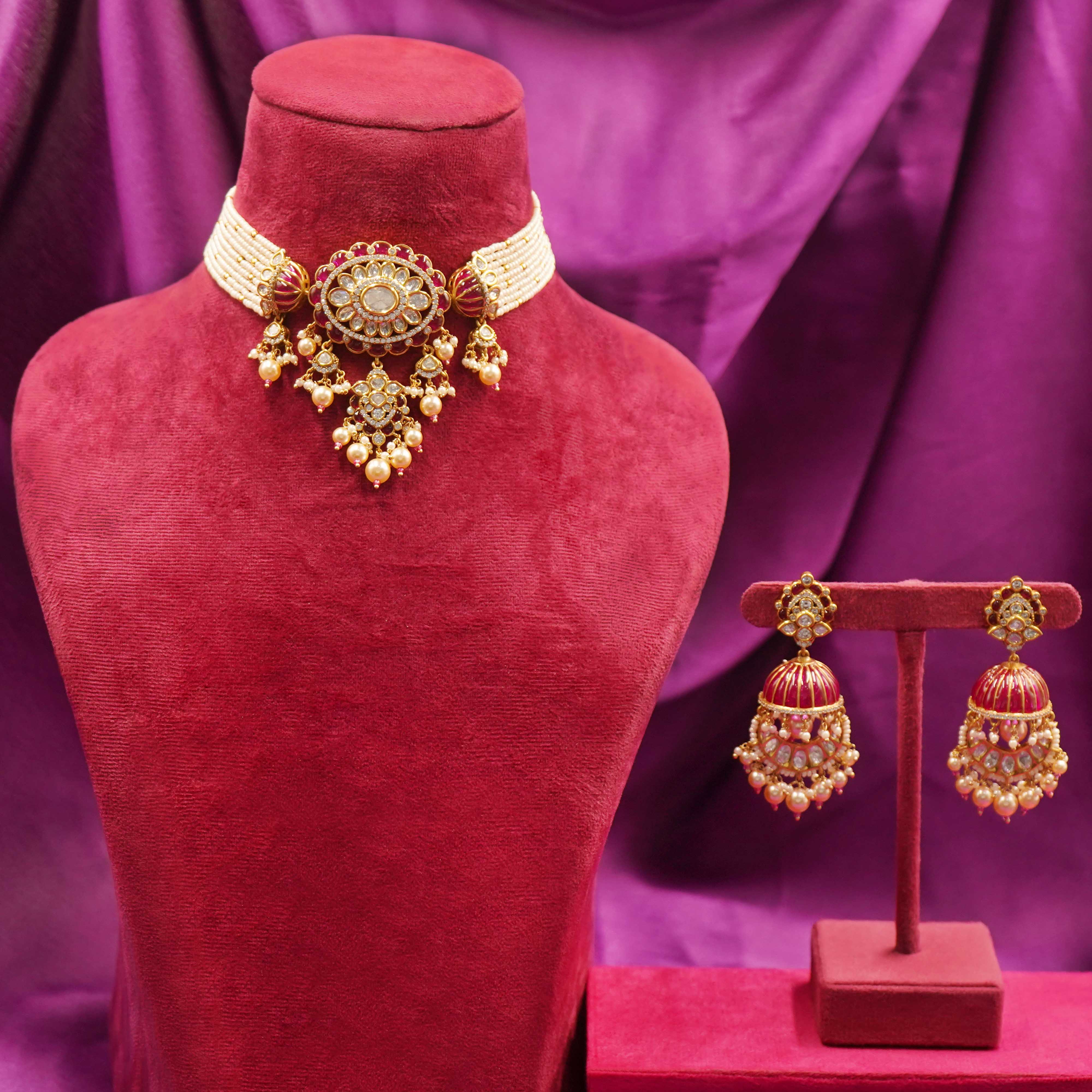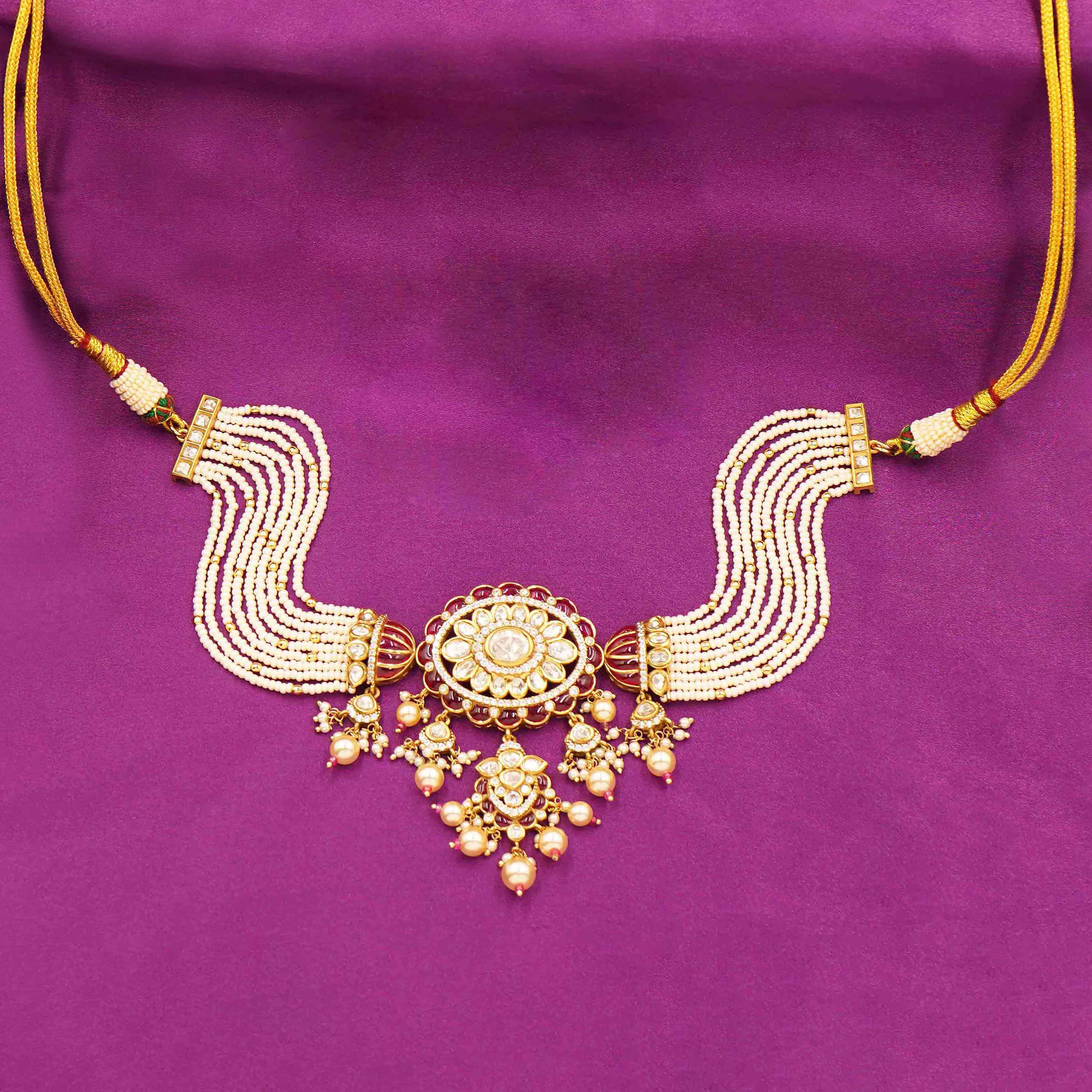 DESCRIPTION - Elevate your festive and bridal look with this exquisite Rajputana-inspired Kundan and pearl choker set. The necklace features a bold central pendant crafted with intricate Kundan work, surrounded by shimmering stones and delicate golden pearl drops that add a touch of regal charm.