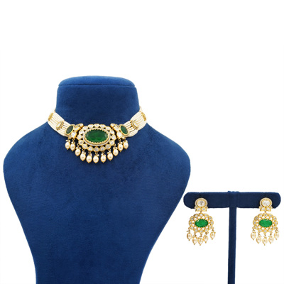 DESCRIPTION - Elevate your ethnic look with this exquisite regal green kundan choker necklace set, beautifully crafted to reflect timeless elegance. The centerpiece features a rich green stone surrounded by intricate kundan work, enhanced with delicate pearl drop embellishments that add graceful movement and charm. Paired with matching statement earrings, this set is perfect for weddings, festive occasions, and traditional celebrations. Designed to complement both classic and contemporary outfits, it brings a royal touch to your jewelry collection.