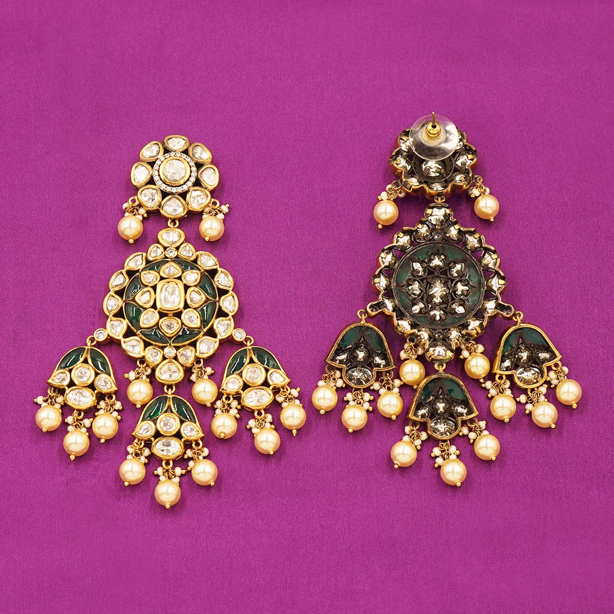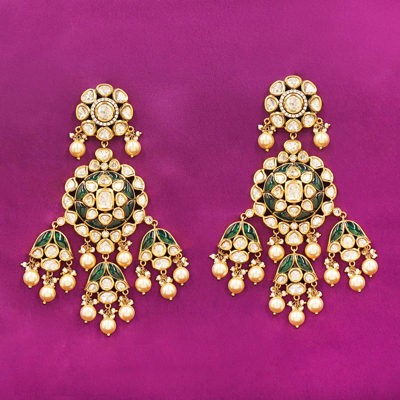 DESCRIPTION - Make a royal statement with these breathtaking Kundan Chandbali earrings, designed with intricate floral motifs and deep green enamel accents. Perfect for weddings, celebrations, and traditional occasions, these earrings capture the essence of heritage craftsmanship and sophisticated beauty.