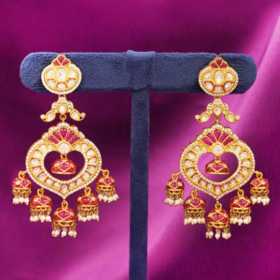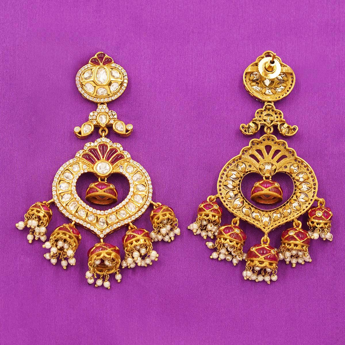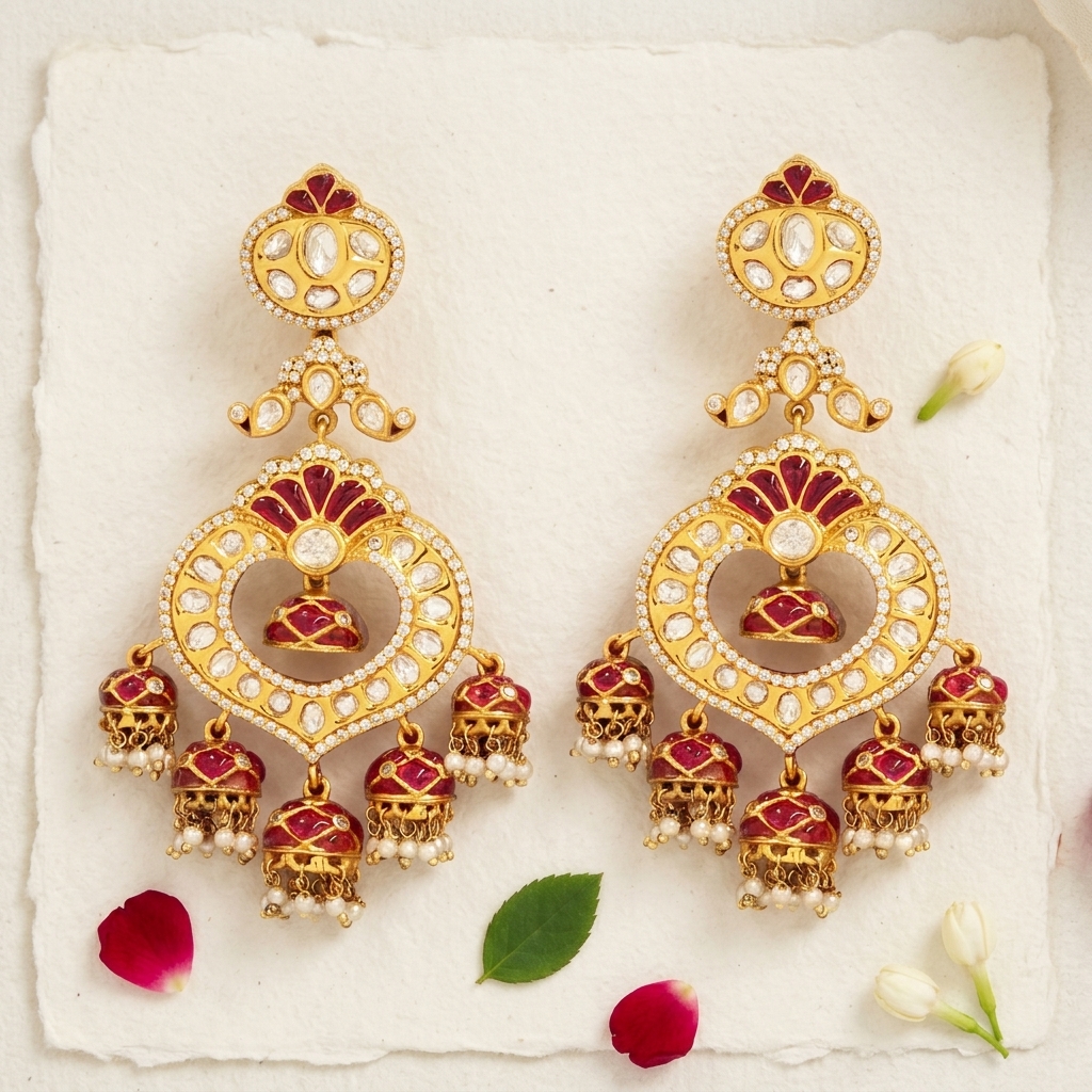 DESCRIPTION - These exquisite earrings feature a heart-shaped Kundan design adorned with rich red enamel and sparkling stones. The multi-layered jhumka drops with pearl clusters add a luxurious traditional charm. A perfect choice for weddings, festive occasions, and grand ethnic looks.