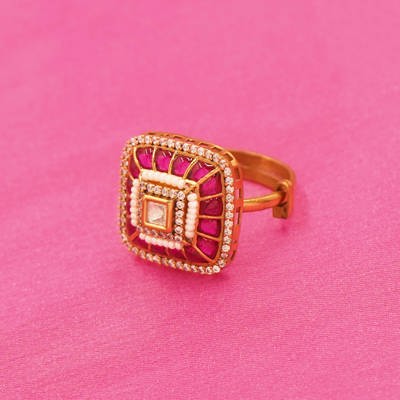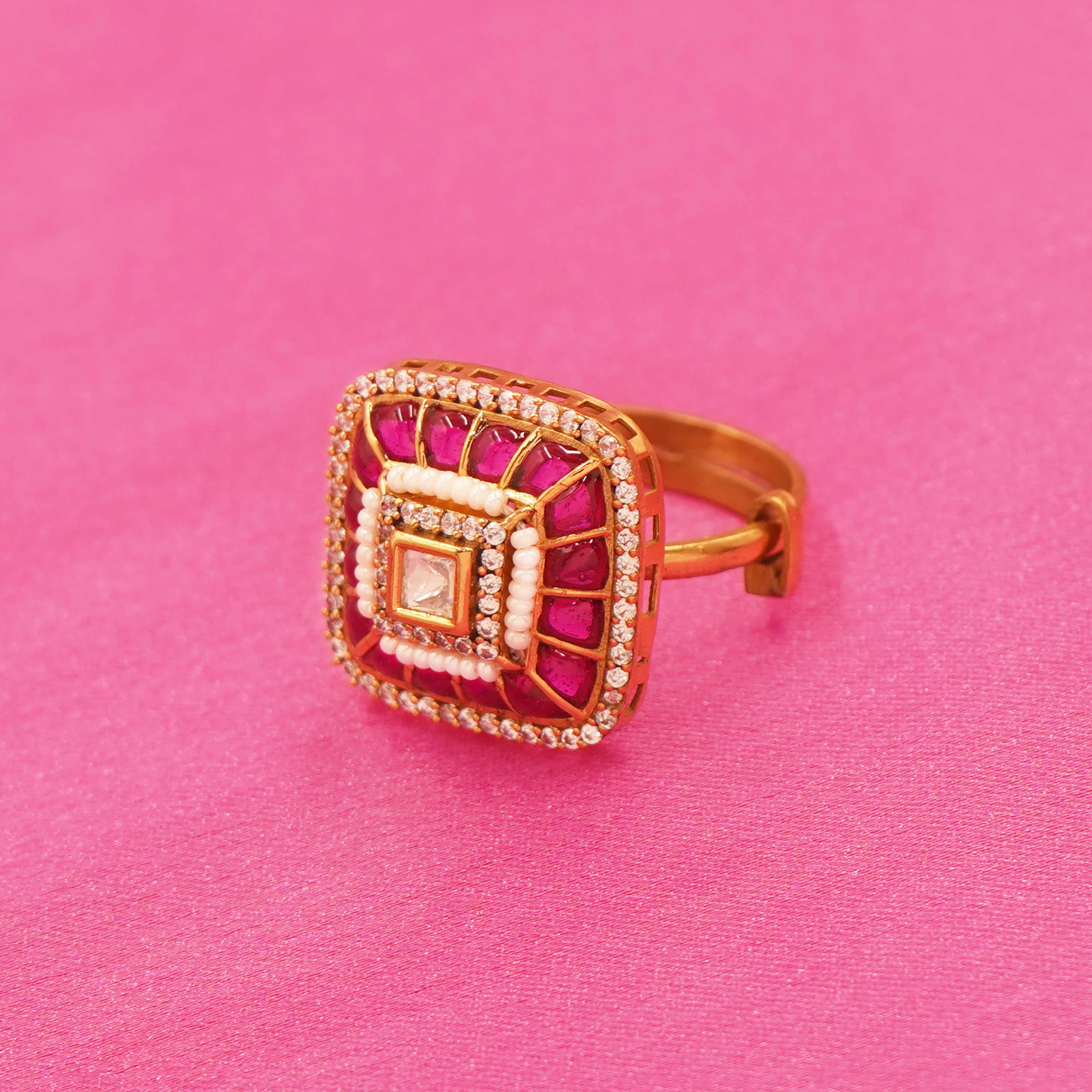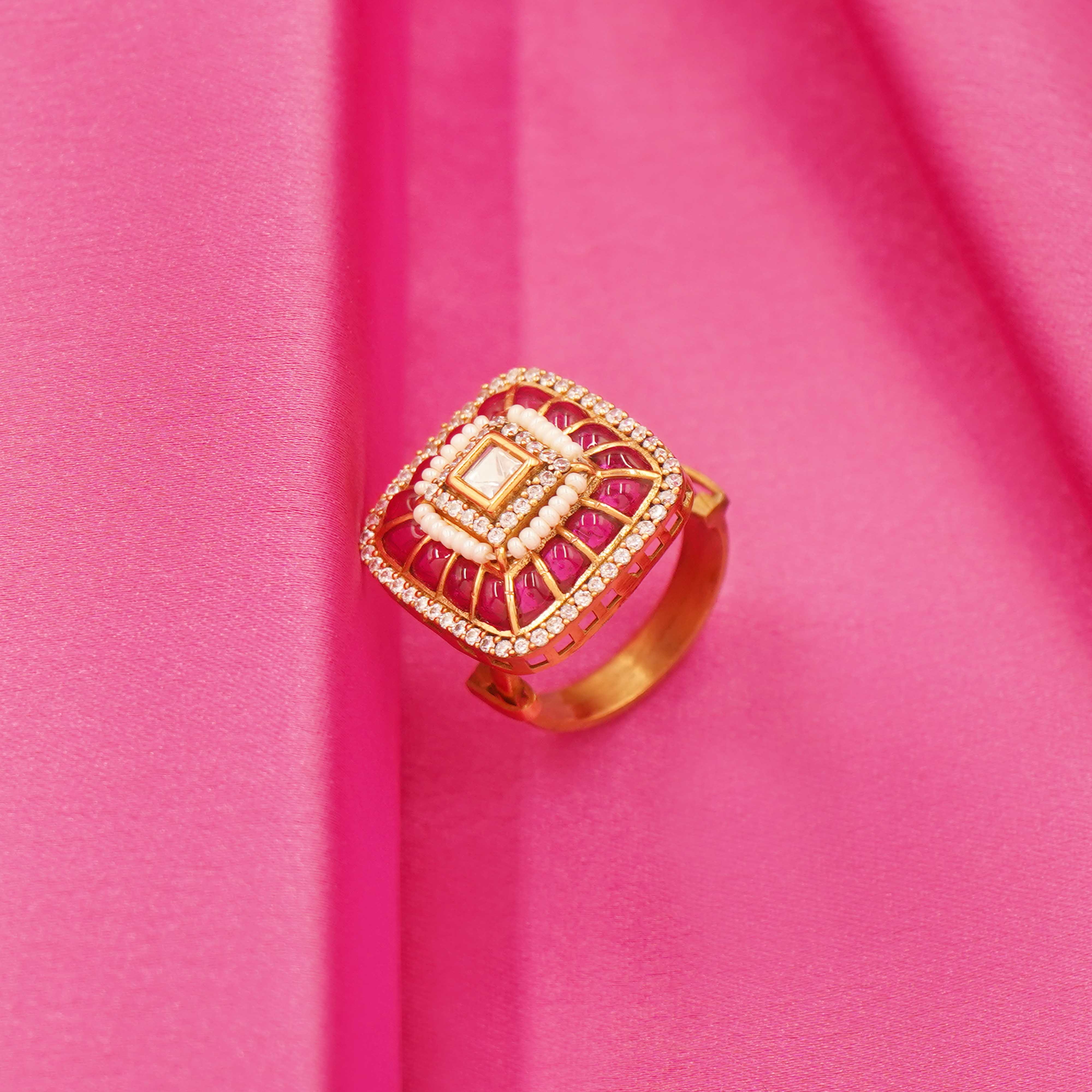 DESCRIPTION - THIS REGAL SQUARE-CUT GOLD TONE RING, DESIGNED TO EXUDE TIMELESS ELEGANCE AND MODERN CHARM. FEATURING A PROMINENT SQUARE CENTERPIECE WITH LAYERED DETAILING AND A POLISHED GOLD TONE FINISH, THIS RING REFLECTS LUXURY FROM EVERY ANGLE. THE STRUCTURED BAND ADDS A CONTEMPORARY TOUCH WHILE MAINTAINING A CLASSIC APPEAL, MAKING IT PERFECT FOR FESTIVE OCCASIONS, WEDDINGS, OR STATEMENT STYLING. WEAR IT SOLO FOR IMPACT OR PAIR IT WITH TRADITIONAL ATTIRE FOR A REFINED, ROYAL LOOK.