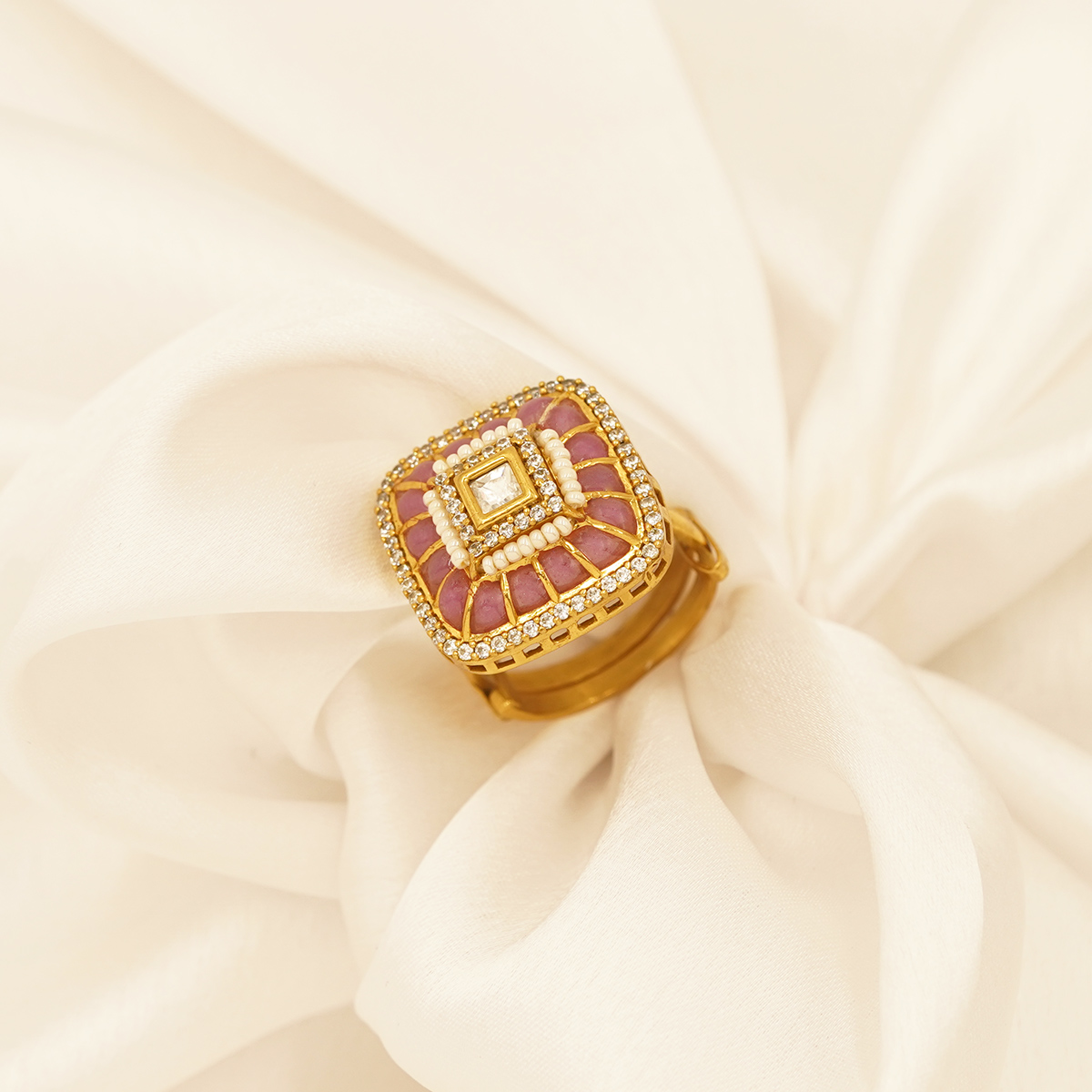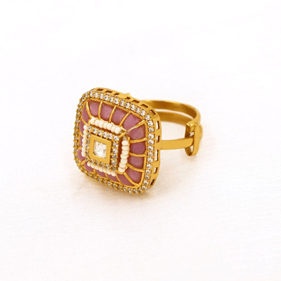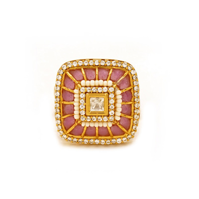 DESCRIPTION - MAKE A BOLD STYLE STATEMENT WITH THIS EXQUISITE SQUARE KUNDAN GOLD TONE RING, DESIGNED TO RADIATE ROYAL ELEGANCE. FEATURING A LAYERED SQUARE CENTERPIECE ADORNED WITH FINELY SET KUNDAN STONES AND DELICATE GOLD TONE DETAILING, THIS RING REFLECTS TIMELESS CRAFTSMANSHIP AND LUXURIOUS CHARM. THE SOFT PINK ACCENTS PAIRED WITH A LUMINOUS CENTRAL STONE CREATE A STRIKING CONTRAST, MAKING IT PERFECT FOR WEDDINGS, FESTIVE OCCASIONS, AND TRADITIONAL CELEBRATIONS. A TRUE BLEND OF HERITAGE DESIGN AND CONTEMPORARY GRACE, THIS RING ADDS A TOUCH OF ROYALTY TO EVERY LOOK.