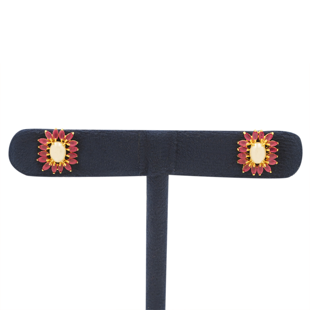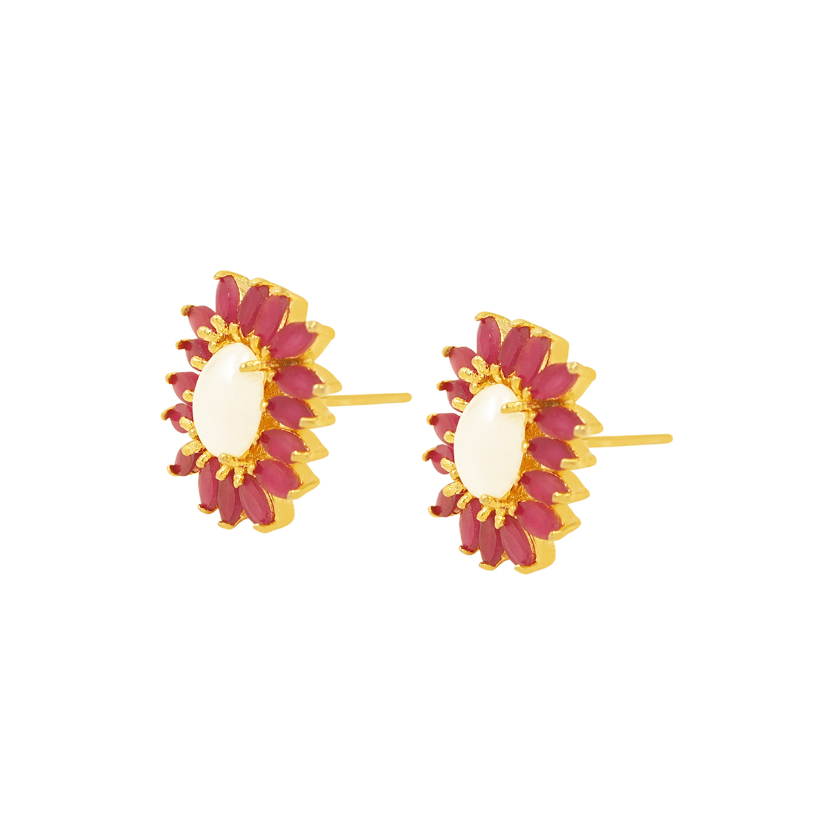 DESCRIPTION - ADD A GENTLE FESTIVE GLOW TO YOUR LOOK WITH THESE ROSE PETAL PEARL STUD EARRINGS. DESIGNED WITH LAYERED PINK PETAL STONES FRAMING A LUMINOUS CENTER PEARL, THESE STUDS BRING A DELICATE CHARM INSPIRED BY BLOOMING FLOWERS. SUBTLE GOLDEN ACCENTS ENHANCE THE DESIGN, GIVING IT A REFINED ETHNIC APPEAL.
