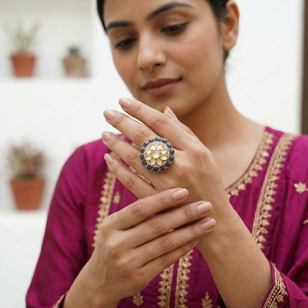 DESCRIPTION - THIS EXQUISITE KUNDAN BLOOM RING, CRAFTED TO CAPTURE TIMELESS ELEGANCE. FEATURING A RADIANT FLORAL CLUSTER OF LUSTROUS WHITE STONES, DELICATELY ACCENTED WITH DEEP ROYAL BLUE ENAMEL DETAILING, THIS RING EXUDES REGAL CHARM. THE GOLD-TONED BAND ENHANCES ITS TRADITIONAL APPEAL, MAKING IT A PERFECT CHOICE FOR WEDDINGS, FESTIVE CELEBRATIONS, AND SPECIAL OCCASIONS. DESIGNED TO STAND OUT, THIS RING PAIRS BEAUTIFULLY WITH ETHNIC ATTIRE AND ADDS A TOUCH OF SOPHISTICATION TO ANY ENSEMBLE.