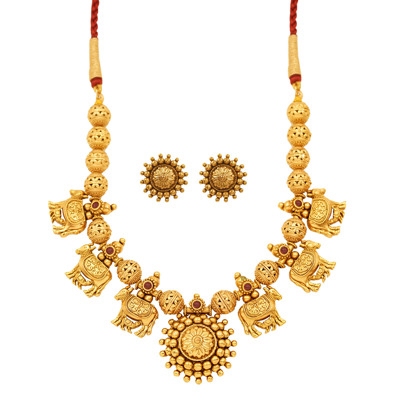 DESCRIPTION - Grace your festive look with this handcrafted elephant motif necklace set. Designed with intricate detailing and a royal antique finish, it adds a touch of heritage elegance to sarees and traditional wear.