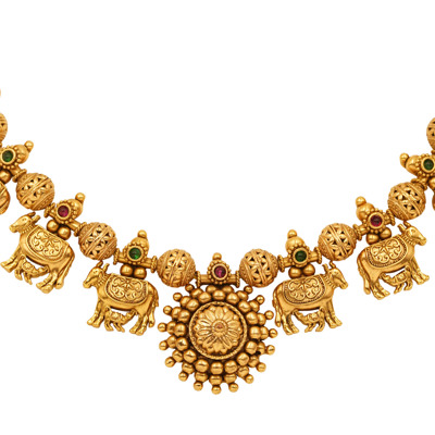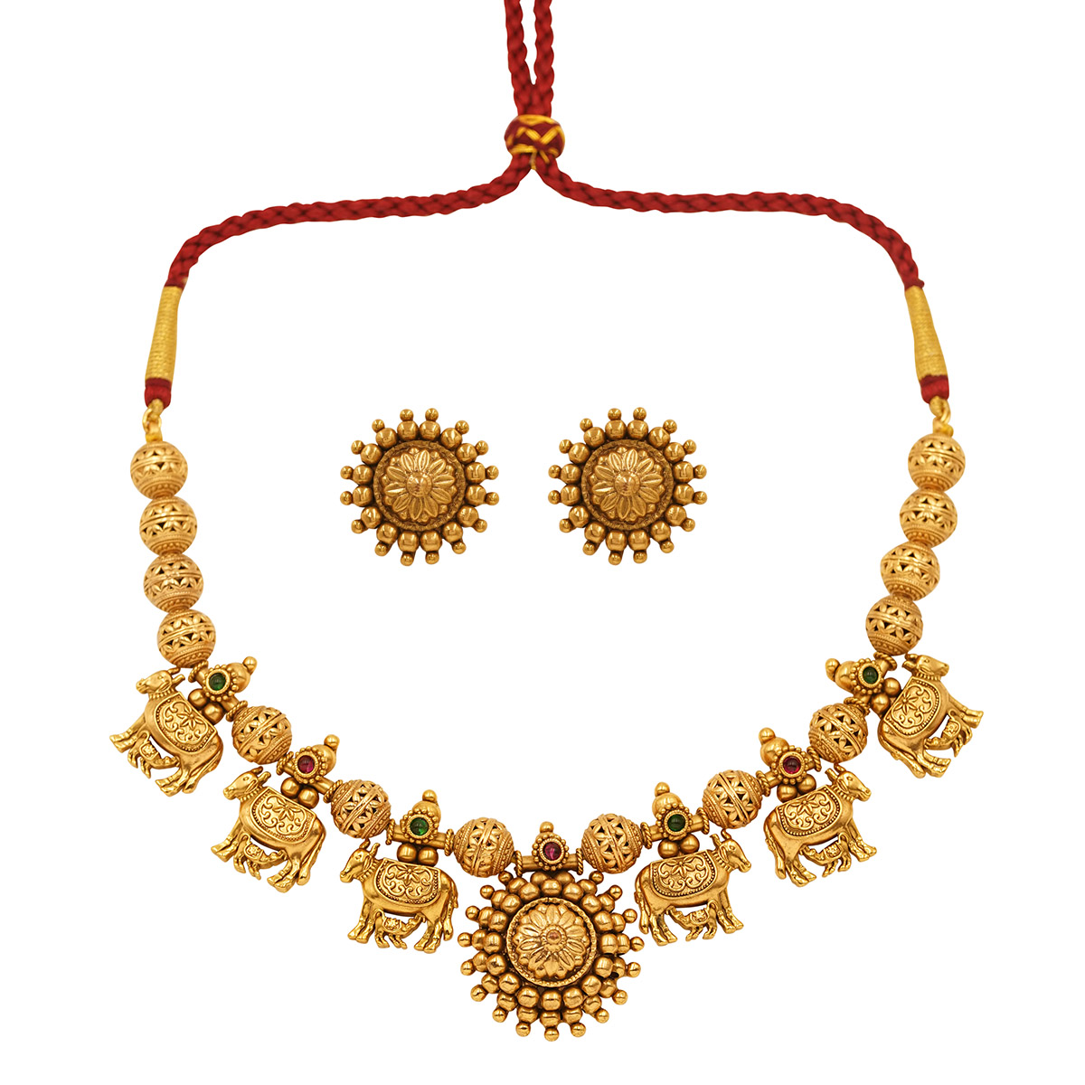 DESCRIPTION - Step into timeless elegance with this royal elephant motif necklace set. Crafted with intricate antique detailing and accented with colored stones, this piece adds regal charm to your festive and ethnic looks.