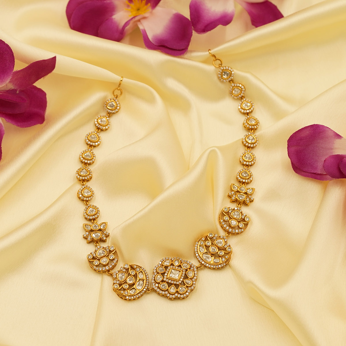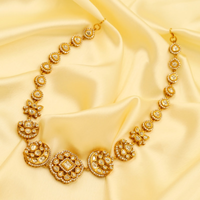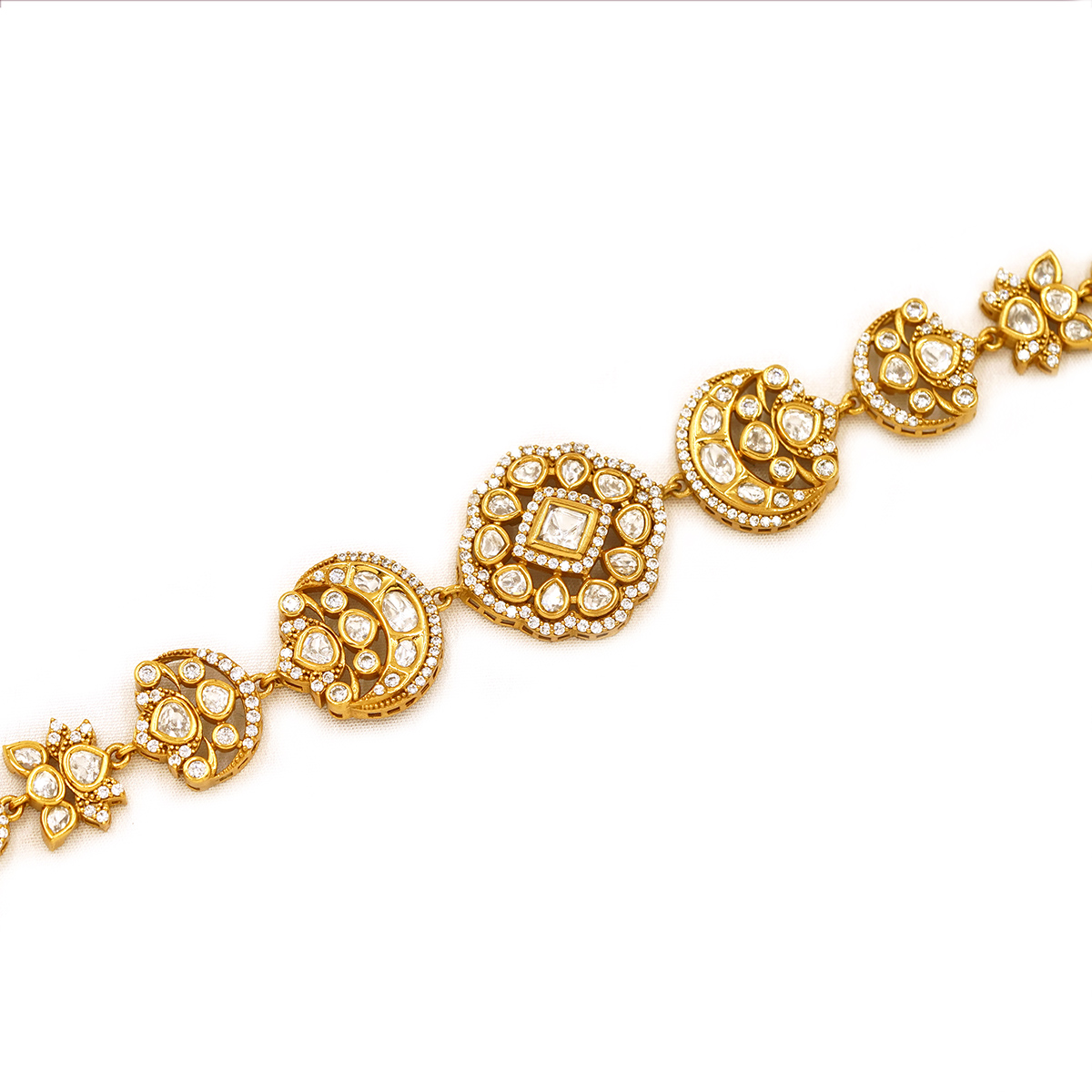 DESCRIPTION - THESE ROYAL GOLD KUNDAN FLORAL MATHA PATTI. DESIGNED IN A LUXURIOUS GOLD-TONE FINISH, THESE MATHA PATTI SHOWCASE AN ELEGANT ARRANGEMENT OF FINELY CRAFTED FLORAL MOTIFS, EACH EMBELLISHED WITH RADIANT KUNDAN-STYLE STONES THAT REFLECT LIGHT WITH EVERY MOVEMENT.