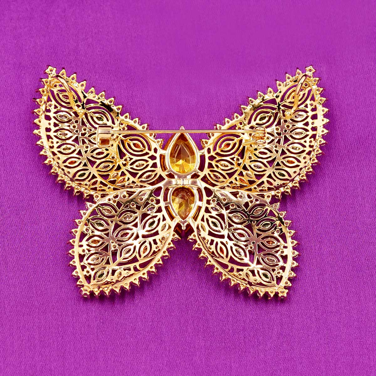 DESCRIPTION - At the center, two stunning yellow crystals form the butterfly’s body, giving the brooch a radiant focal point. The combination of color, sparkle, and craftsmanship makes this piece a true statement accessory. Perfect for sarees, dupattas, gowns, shawls, wedding outfits, and festive wear, this brooch adds elegance, charm, and royal sophistication to any ensemble.