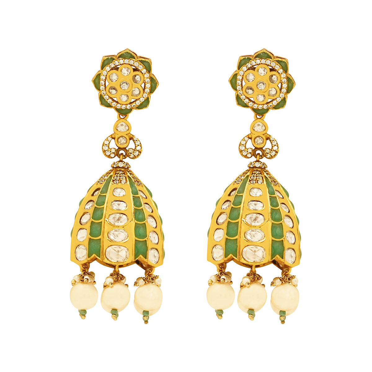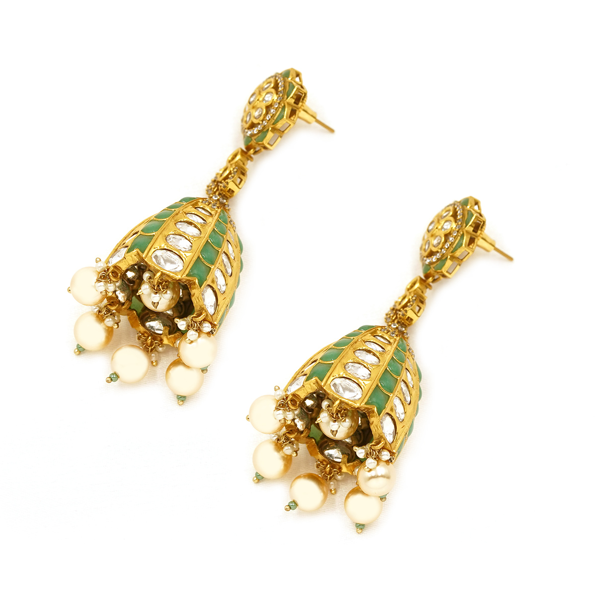 DESCRIPTION - ELEVATE YOUR TRADITIONAL LOOK WITH THESE EXQUISITELY CRAFTED ROYAL KUNDAN DOME JHUMKA EARRINGS. DESIGNED IN A LUXURIOUS GOLD-TONE FINISH, THE EARRINGS FEATURE AN ORNATE FLORAL STUD EMBELLISHED WITH HAND-SET KUNDAN STONES, LEADING INTO A GRAND DOME-SHAPED JHUMKA. THE DOME IS BEAUTIFULLY DETAILED WITH SYMMETRICAL KUNDAN INLAYS AND FINISHED WITH DELICATE PEARL-LIKE DROPS THAT SWAY GRACEFULLY WITH EVERY MOVEMENT.