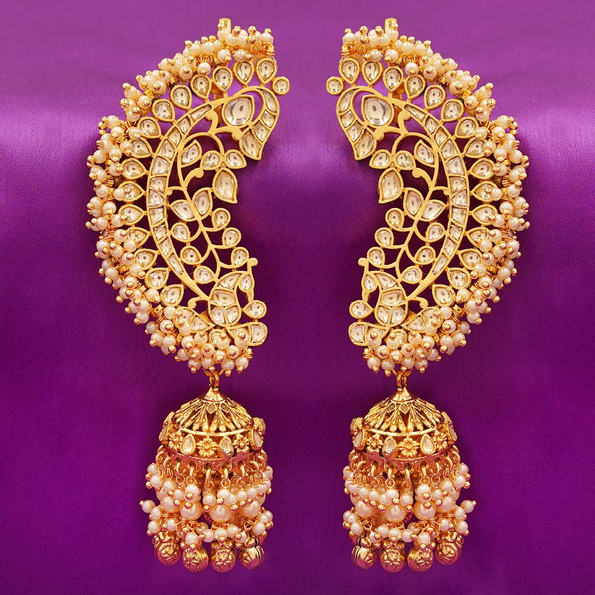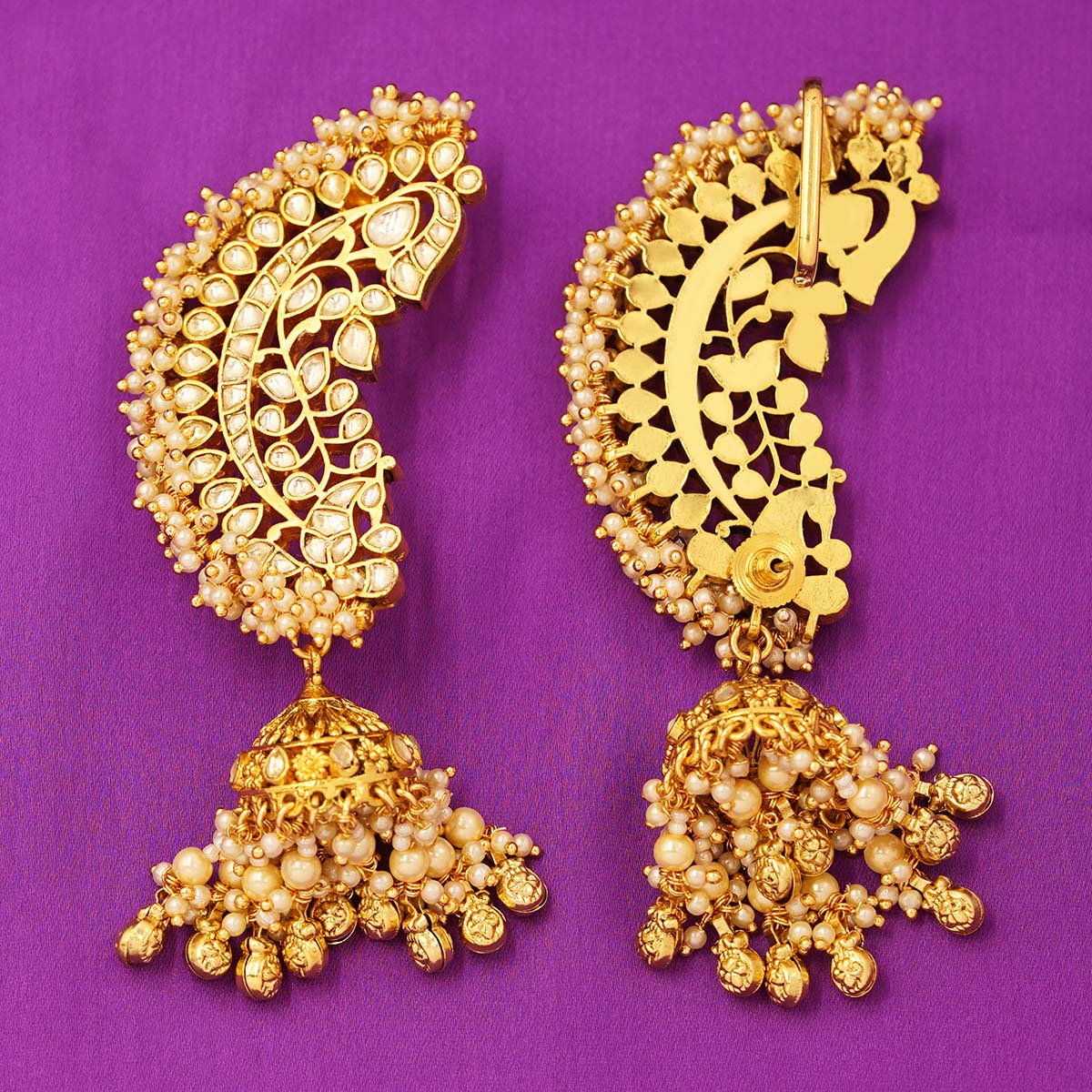Royal Kundan & Pearl Crescent Earrings with Jhumka Drops