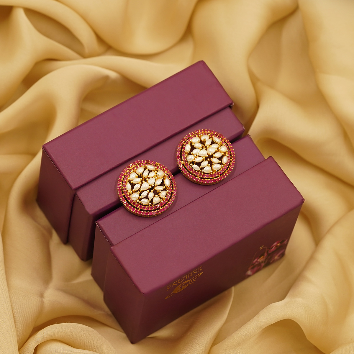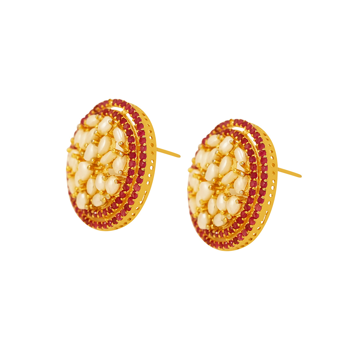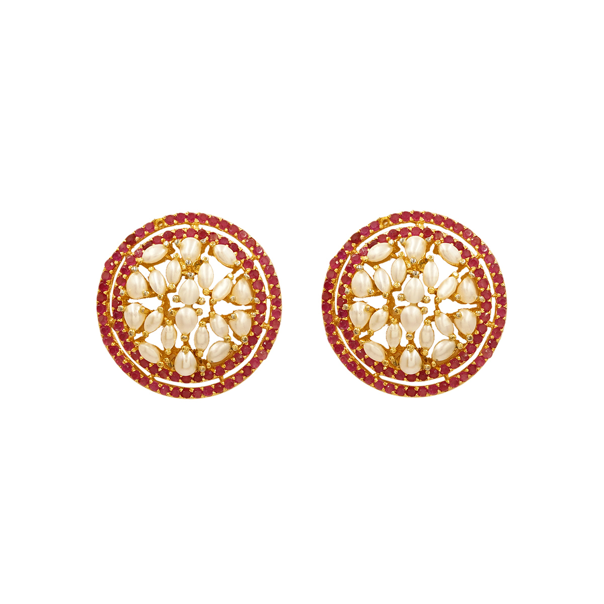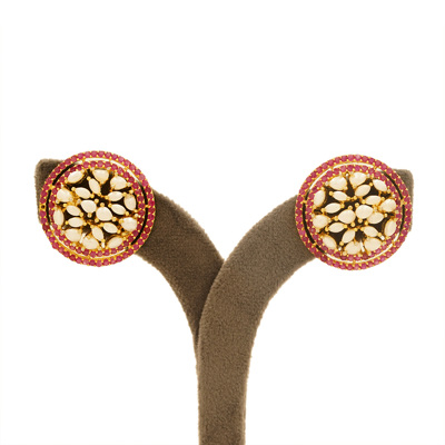 DESCRIPTION - THESE ELEGANT ROUND STUD EARRINGS FEATURE A CLASSIC KUNDAN DESIGN WITH DELICATE PEARL ACCENTS, BEAUTIFULLY SET AGAINST A RICH GOLD-TONED BASE. SURROUNDED BY FINE DETAILING AND A SUBTLE RED BORDER, THEY OFFER A PERFECT BLEND OF TRADITIONAL CRAFTSMANSHIP AND TIMELESS CHARM. IDEAL FOR WEDDINGS, FESTIVE OCCASIONS, OR ADDING A REGAL TOUCH TO EVERYDAY ETHNIC WEAR.