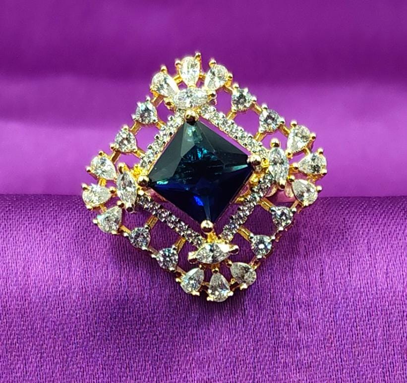 DESCRIPTION - A STATEMENT OF BOLD ELEGANCE, THIS STUNNING RING FEATURES A DEEP MIDNIGHT-BLUE SQUARE CRYSTAL AT ITS CENTER, FRAMED BY A RADIANT HALO OF SPARKLING CLEAR STONES. SET IN A RICH GOLD-TONE LATTICE DESIGN, IT REFLECTS LIGHT BEAUTIFULLY FROM EVERY ANGLE, CREATING A LUXURIOUS AND REGAL LOOK. PERFECT FOR FESTIVE OCCASIONS, EVENING WEAR, OR ADDING A TOUCH OF GLAMOUR TO ANY OUTFIT, THIS RING IS DESIGNED TO STAND OUT WITH TIMELESS SOPHISTICATION.
