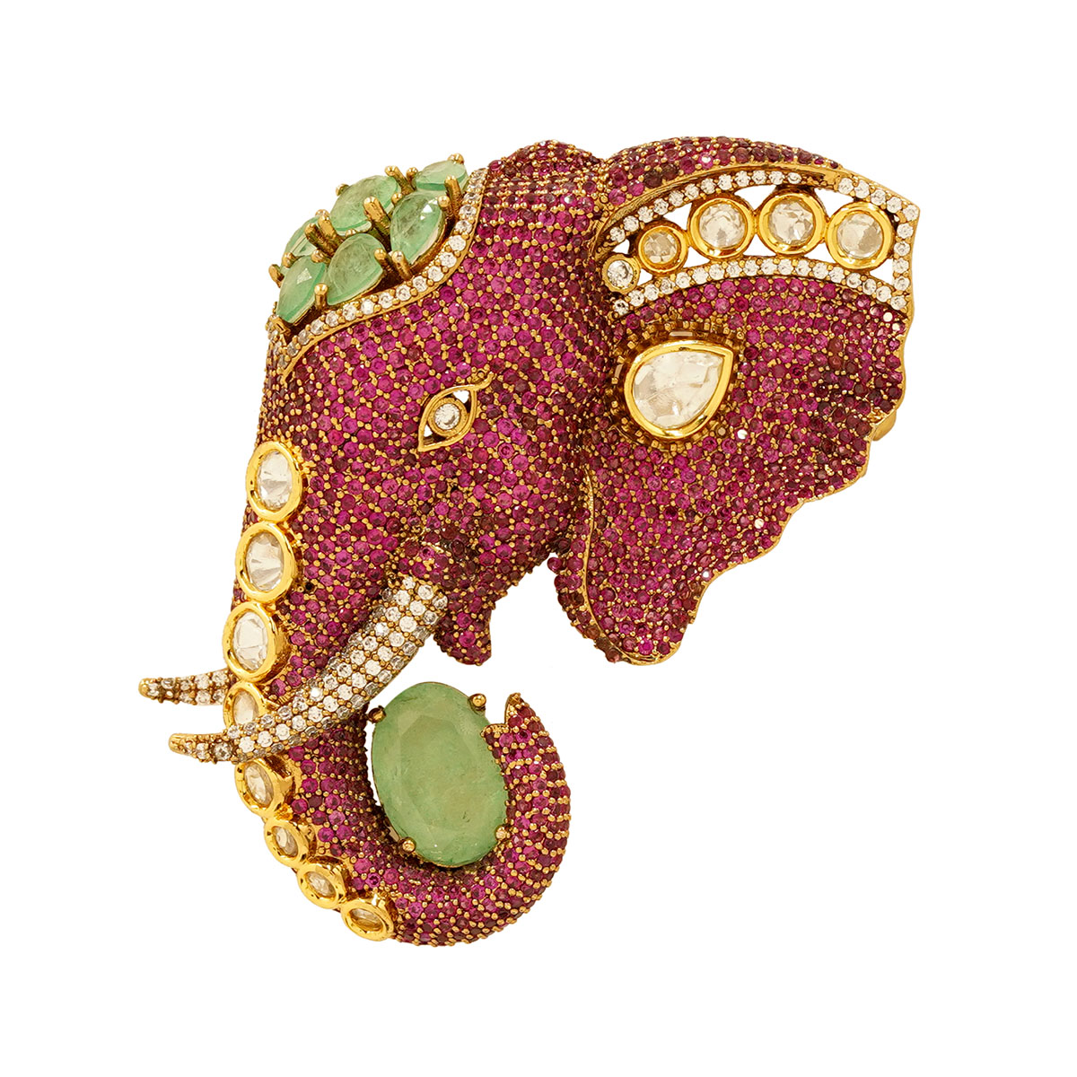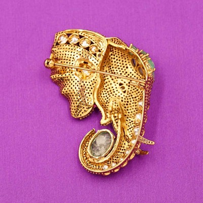 DESCRIPTION - This exquisite brooch features a majestic elephant design, richly studded with vibrant pink micro-crystals that create a breathtaking sparkle. The piece is adorned with premium Kundan stones on the ear, forehead, and trunk, adding a royal traditional touch.