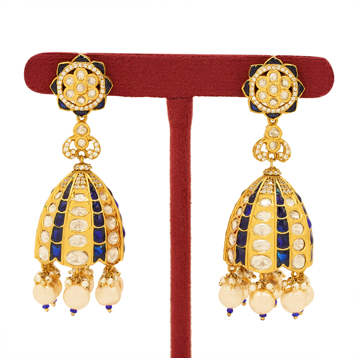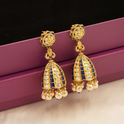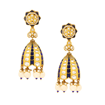 DESCRIPTION - ELEVATE YOUR TRADITIONAL LOOK WITH THESE EXQUISITELY CRAFTED ROYAL POLKI DROP EARRINGS. FEATURING A FLORAL-INSPIRED STUD TOP AND AN ELEGANT DOME-SHAPED DROP, THESE EARRINGS ARE ADORNED WITH SHIMMERING POLKI-STYLE STONES, DEEP ROYAL BLUE ENAMEL ACCENTS, AND LUSTROUS PEARL DROPS. THE INTRICATE GOLD-TONED DETAILING ADDS A TOUCH OF REGAL CHARM, MAKING THEM PERFECT FOR WEDDINGS, FESTIVE OCCASIONS, AND GRAND CELEBRATIONS. A TIMELESS STATEMENT PIECE THAT BLENDS HERITAGE ARTISTRY WITH REFINED ELEGANCE.
