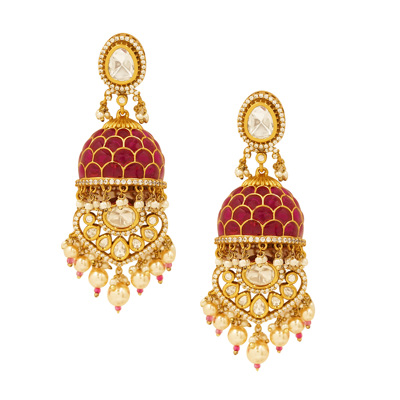 DESCRIPTION - THESE EXQUISITE JHUMKA EARRINGS BLEND TIMELESS INDIAN CRAFTSMANSHIP WITH REGAL ELEGANCE. FEATURING A RICH RUBY-RED ENAMEL DOME ADORNED WITH INTRICATE GOLD TONE DETAILING, EACH PIECE IS CROWNED WITH A CLASSIC KUNDAN-STYLE STONE FOR A LUXURIOUS FINISH. CASCADING PEARL AND GOLD TONE BEAD DROPS ADD GRACEFUL MOVEMENT AND A SOFT GLOW, MAKING THEM PERFECT FOR WEDDINGS, FESTIVE OCCASIONS, AND TRADITIONAL ENSEMBLES. A STATEMENT OF HERITAGE BEAUTY, THESE EARRINGS BRING ROYAL CHARM TO EVERY LOOK.