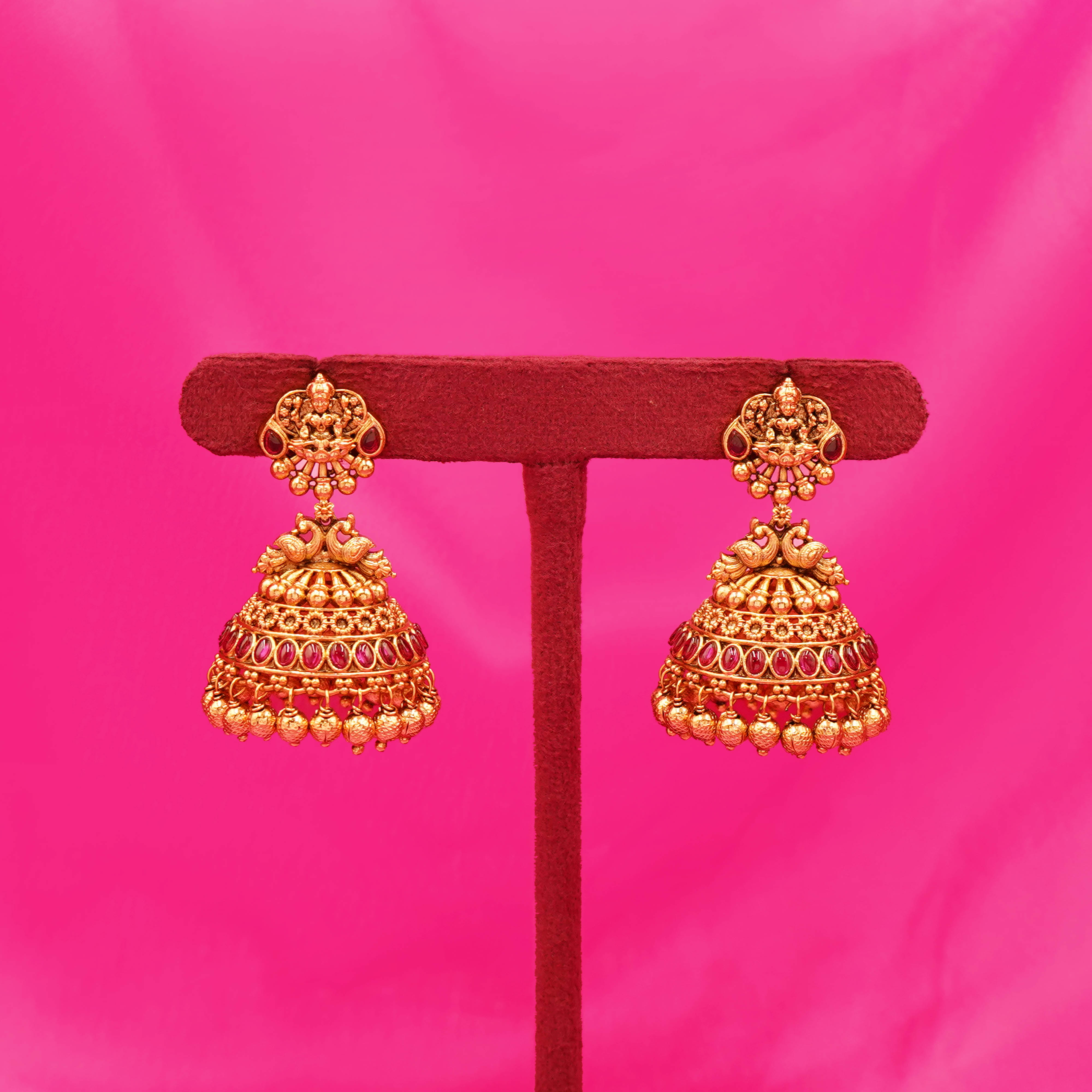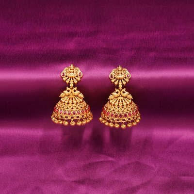 DESCRIPTION - JHUMKA/EARRING, THE EARRINGS ARE TRADITIONAL INDIAN JHUMKA-STYLE EARRINGS, INTRICATELY DESIGNED WITH GOLD-TONE METAL AND ADORNED WITH RUBY-COLORED STONES. THE EARRINGS ARE TRADITIONAL INDIAN JHUMKA-STYLE EARRINGS, INTRICATELY DESIGNED WITH GOLD-TONE METAL AND ADORNED WITH RUBY-COLORED STONES.