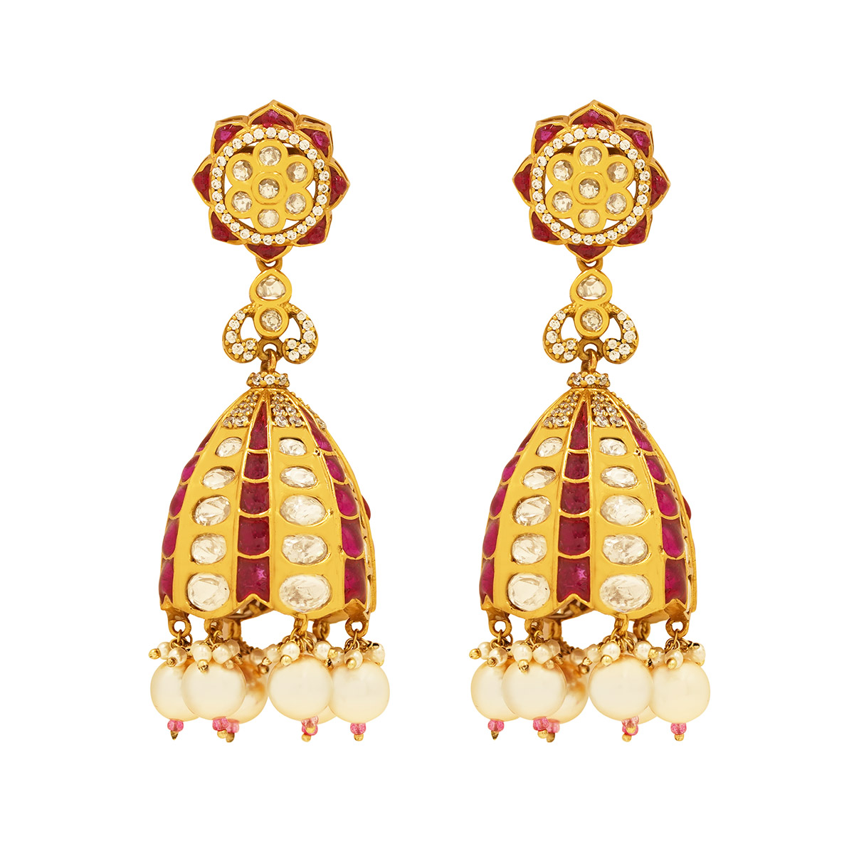 DESCRIPTION - MAKE A REGAL STATEMENT WITH THESE EXQUISITELY CRAFTED JHUMKA EARRINGS, FEATURING A CLASSIC BLEND OF RUBY-RED STONES, KUNDAN-STYLE DETAILING, AND LUSTROUS GOLD TONES. THE FLORAL STUD TOP LEADS INTO A GRACEFUL DOME DROP, ADORNED WITH SHIMMERING WHITE STONES AND RICH RED ENAMEL PANELS. FINISHED WITH DELICATE PEARL AND GOLD BEAD DANGLERS, THESE EARRINGS SWAY BEAUTIFULLY WITH EVERY MOVEMENT. PERFECT FOR WEDDINGS, FESTIVE CELEBRATIONS, AND TRADITIONAL OCCASIONS, THEY ADD TIMELESS ELEGANCE AND ROYAL CHARM TO ANY ETHNIC ENSEMBLE.