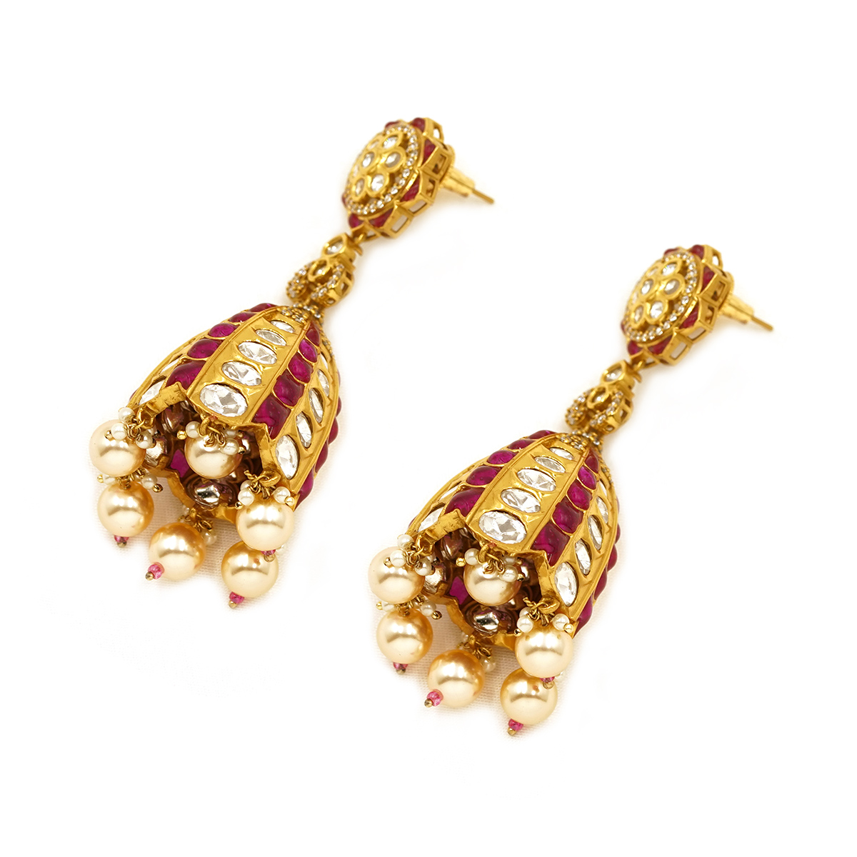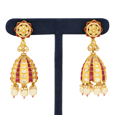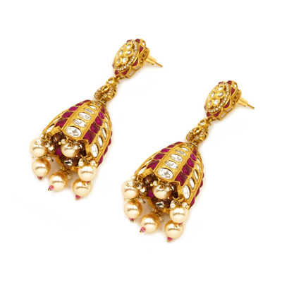 Ruby Kundan Jhumka Drop Earrings with Pearl & Gold Tone Bead Accents