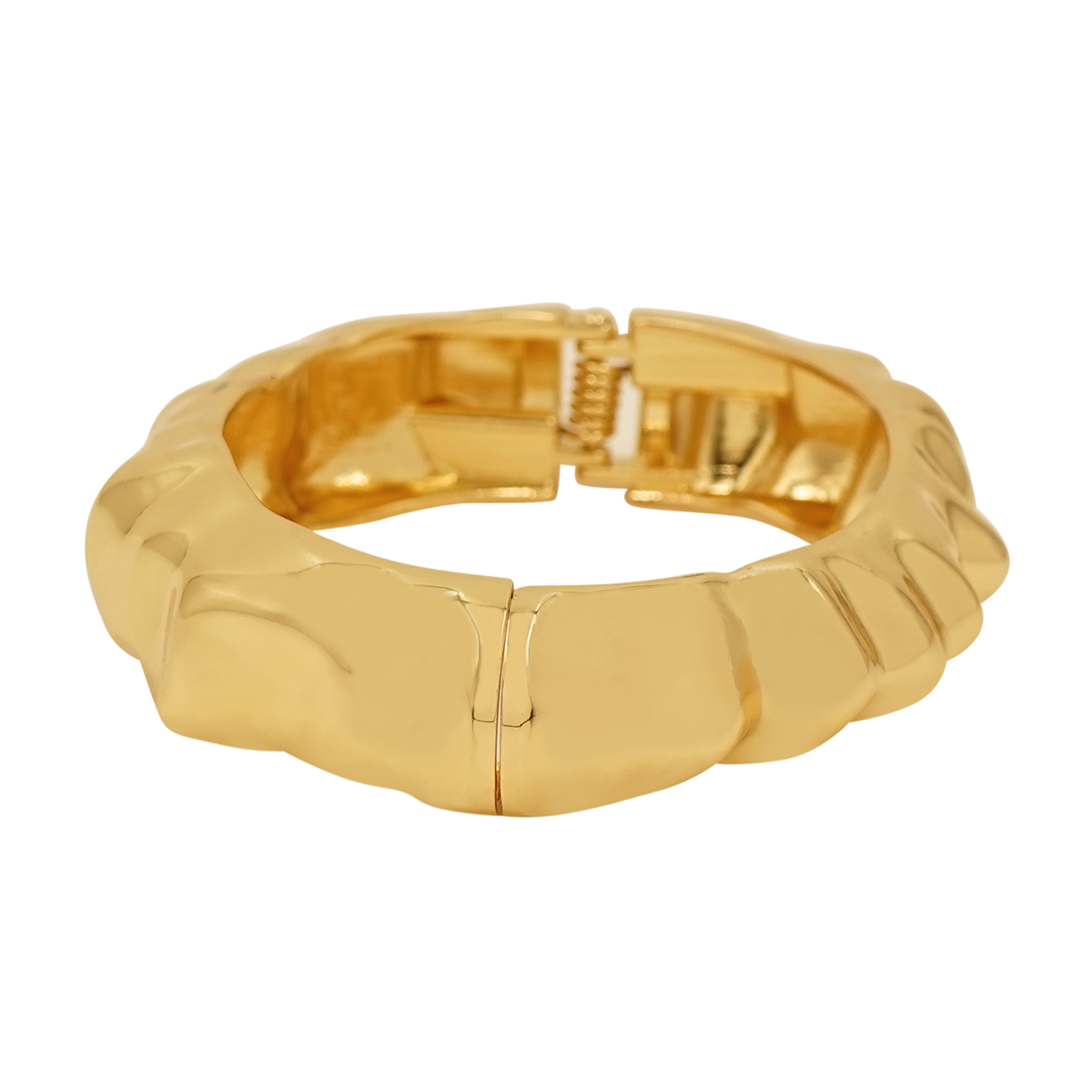 DESCRIPTION - A chunky, gold-tone bangle with a distinctive sculptural design. The bracelet features an articulated, hinged clasp for easy wear. Its highly polished finish and irregular, ridged surface give it a unique, contemporary look that mimics the texture of natural bamboo. This piece is a bold statement accessory.