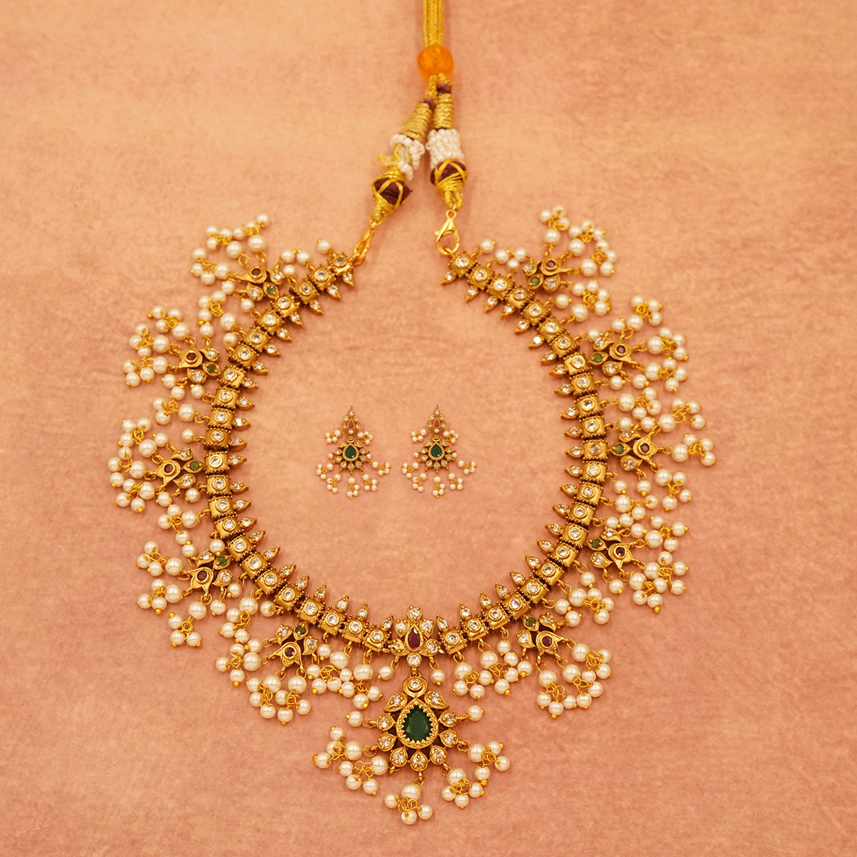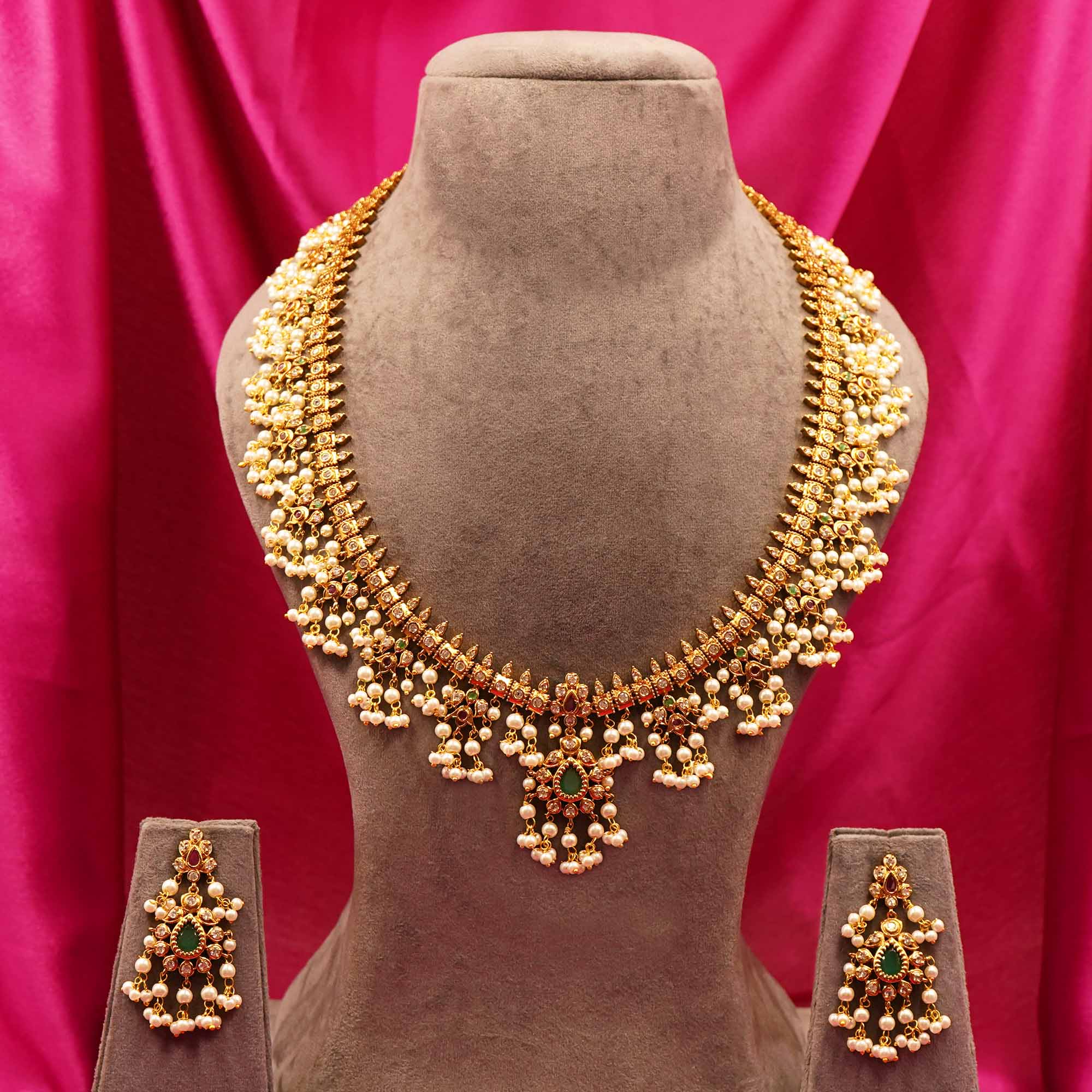 DESCRIPTION - TRADITIONAL NECKLACE SET/ KUNDAN NECKLACE SET, THE NECKLACE SET IS A TRADITIONAL INDIAN JEWELRY SET CONSISTING OF A NECKLACE AND MATCHING EARRINGS. THE NECKLACE SET FEATURES INTRICATE GOLD-TONE WORK EMBELLISHED WITH PEARLS, GREEN AND PINK GEMSTONES, AND A DETAILED DESIGN TYPICAL OF TEMPLE OR BRIDAL JEWELRY.