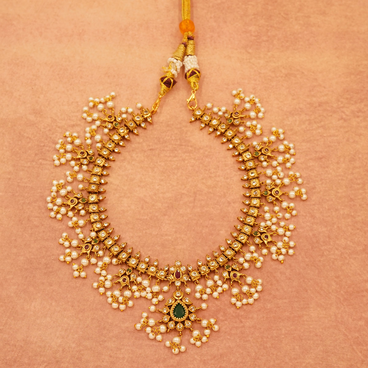 Shringarika Kundan Stone Necklace with Pearls, Temple Motifs, Bridal Grandeur