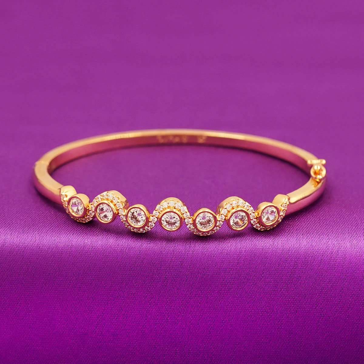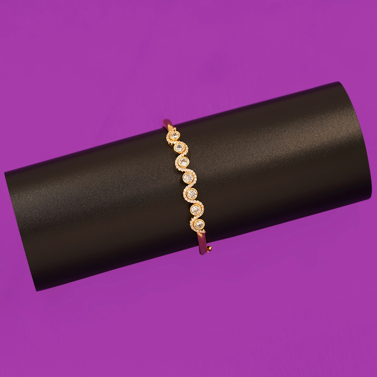 DESCRIPTION - This elegant bracelet showcases a graceful line of round-cut shimmering crystals, each set in a delicate golden frame. The sleek and minimal design gives it a classy and modern appeal, perfect for both everyday wear and special occasions.