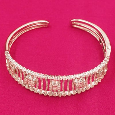 DESCRIPTION - This luxurious wide bangle features a bold geometric pattern accented with sparkling zircon stones throughout. The open lattice structure adds depth and dimension, while the symmetrical rectangular designs create a striking and elegant look. A perfect piece for adding glamour to any formal or festive occasion.