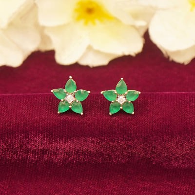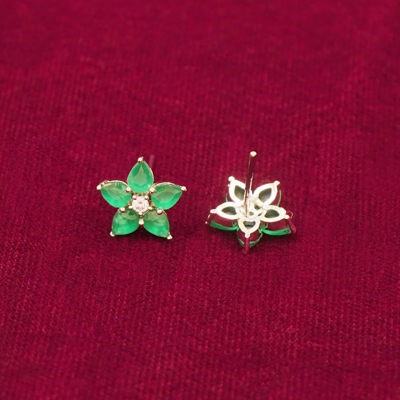 DESCRIPTION - These charming stud earrings feature a delicate flower design with vibrant green stones forming the petals. In the center, a small, radiant stone enhances the overall elegance, making these earrings a perfect accessory for any occasion. Simple yet striking, they add a touch of nature-inspired beauty to your look.