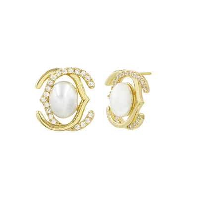 DESCRIPTION - These stunning gold-Tone stud earrings. Designed with a unique interlocking "C" shape encrusted with sparkling clear crystals, each earring features a central oval faux pearl that exudes timeless elegance.
