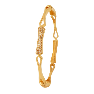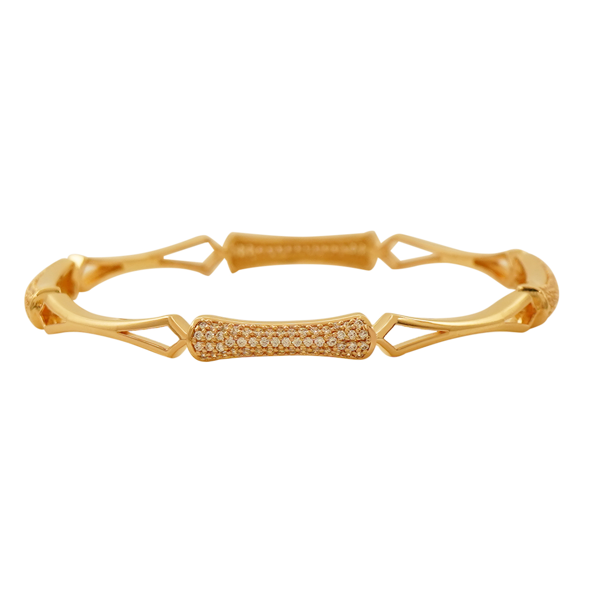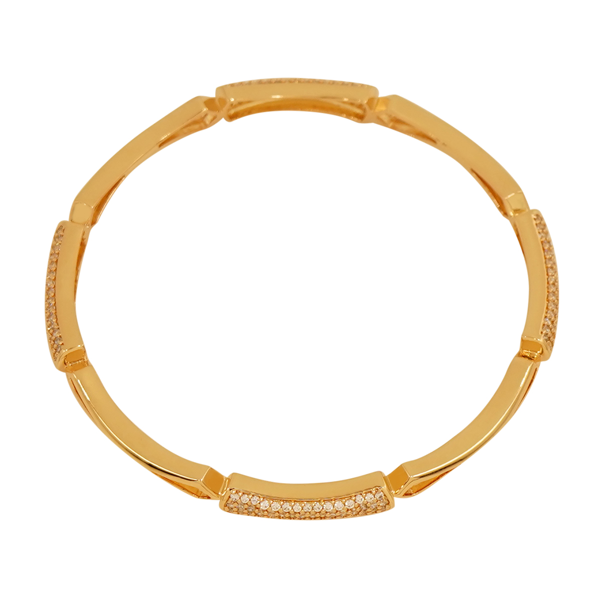 DESCRIPTION - This elegant bangle pair features a modern segmented design, highlighted with sparkling micro-studded stone panels for a refined touch. Finished in a premium gold-tone, these bangles offer a perfect blend of style, shine, and comfort. Ideal for festive wear, parties, or everyday elegance, this pair adds a classy and contemporary charm to any outfit.