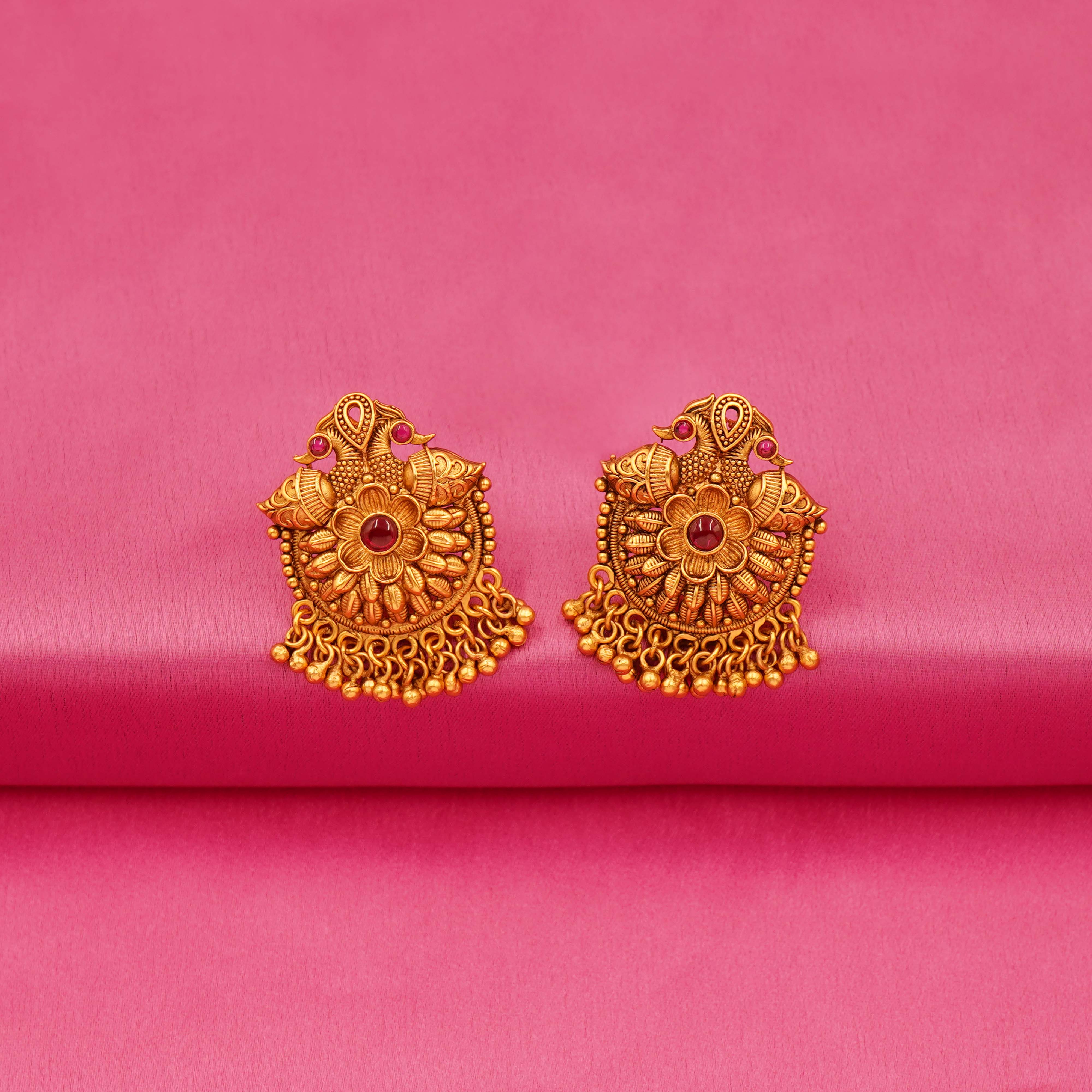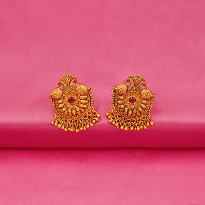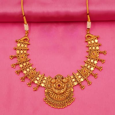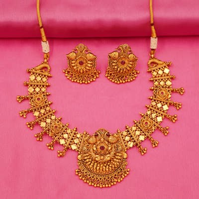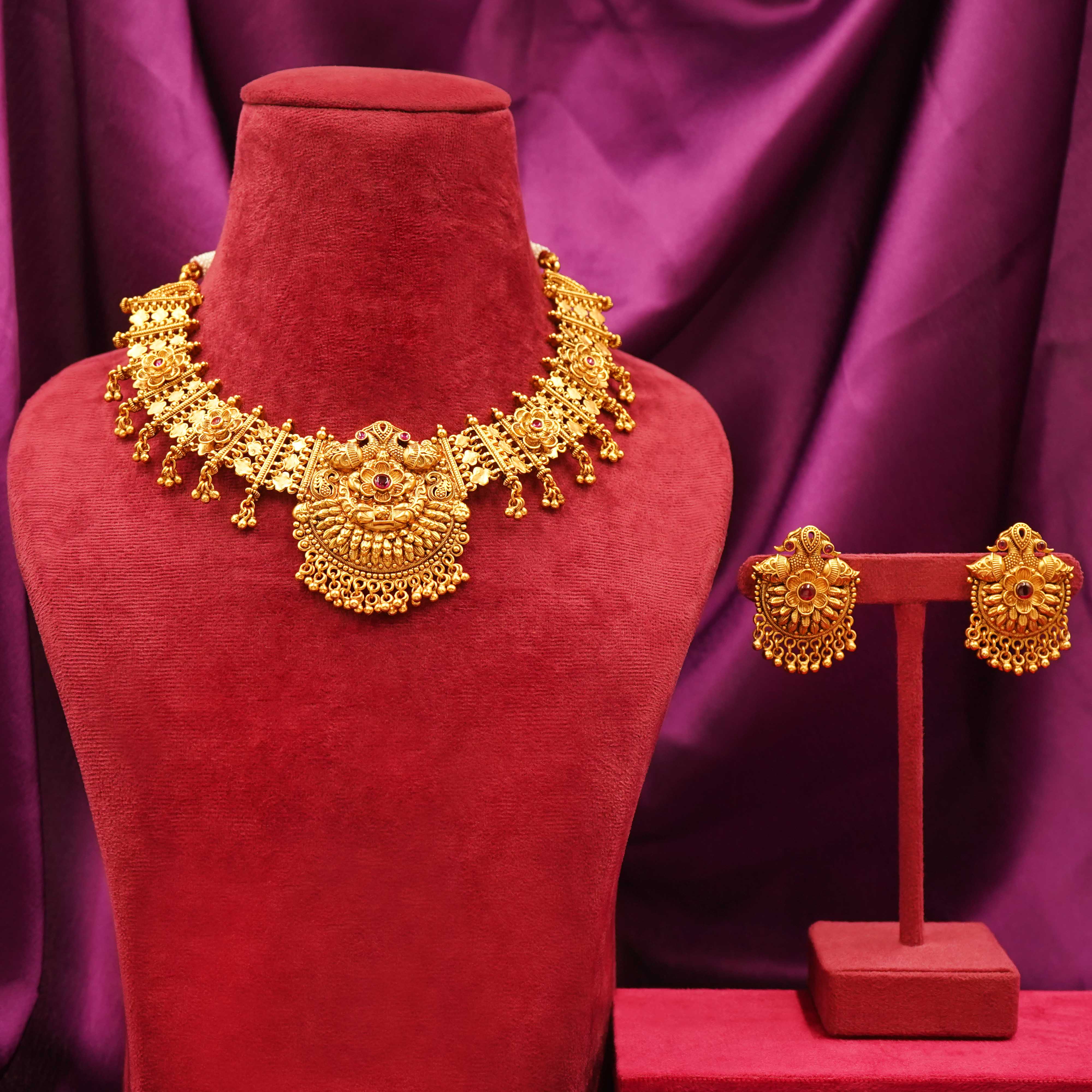 DESCRIPTION - NECKLACE SET/ CHOCKER SET, SOUTH‐INDIAN “TEMPLE JEWELRY” SET, CONSISTING OF A GOLD-TONE METAL HARAM STYLE NECKLACE AND MATCHING EARRINGS. THIS KIND OF PIECE IS OFTEN WORN FOR WEDDINGS AND FESTIVE OCCASIONS. INDIAN “TEMPLE JEWELRY” SET, CONSISTING OF A GOLD-TONE METAL HARAM STYLE NECKLACE AND MATCHING EARRINGS. THIS KIND OF PIECE IS OFTEN WORN FOR WEDDINGS AND FESTIVE OCCASIONS.