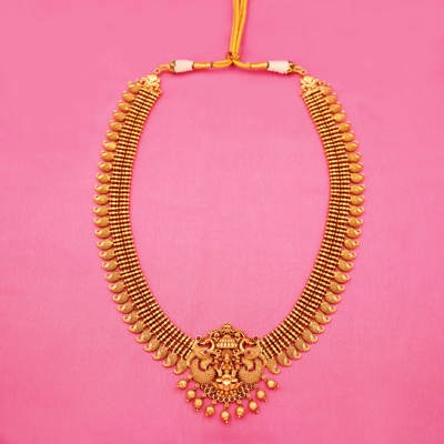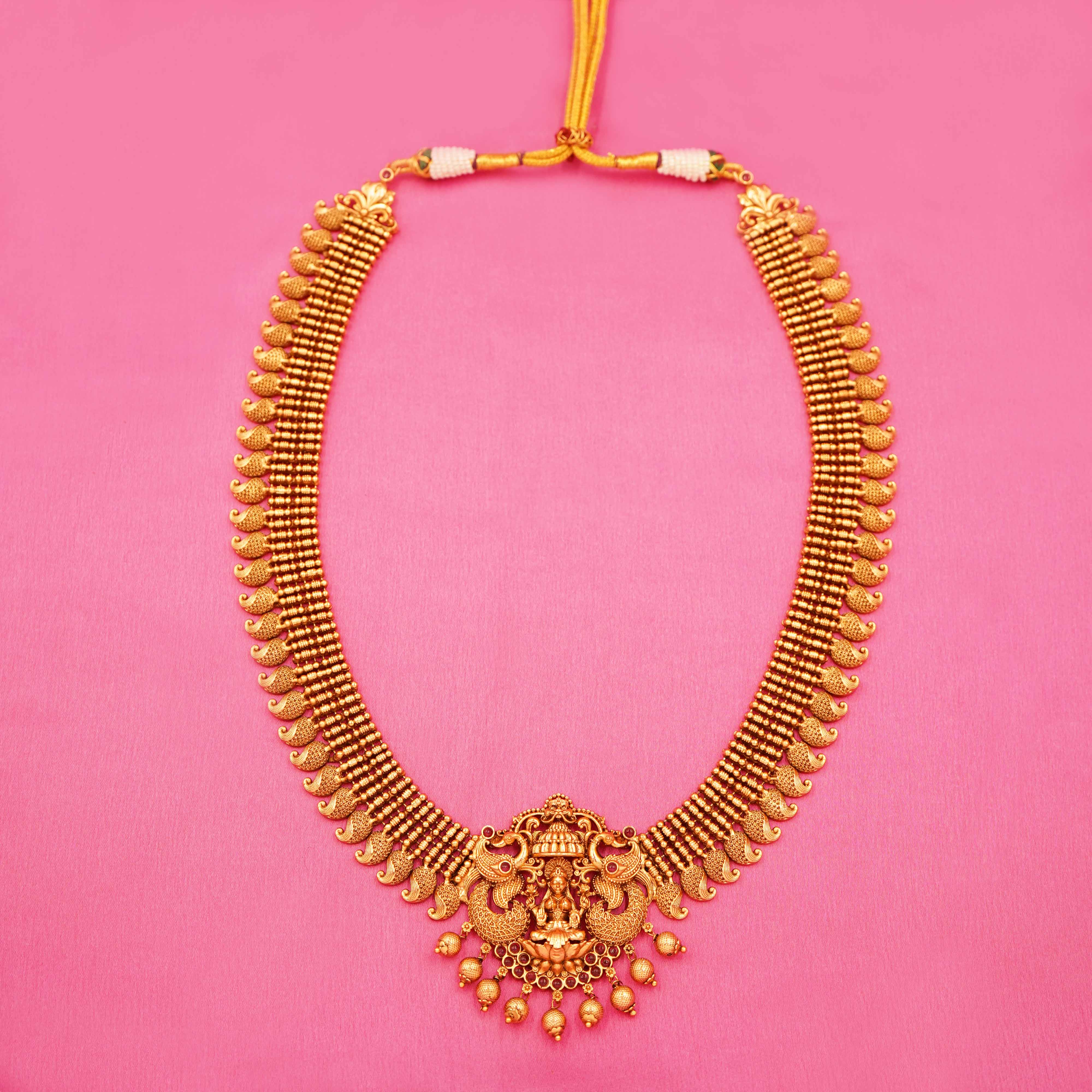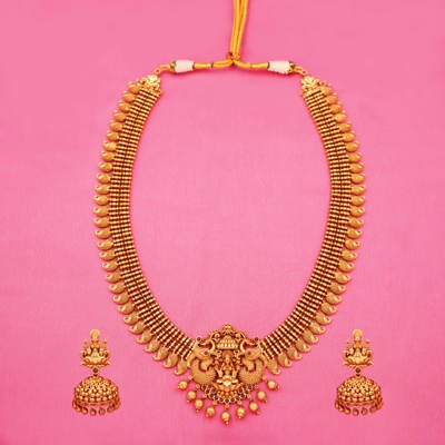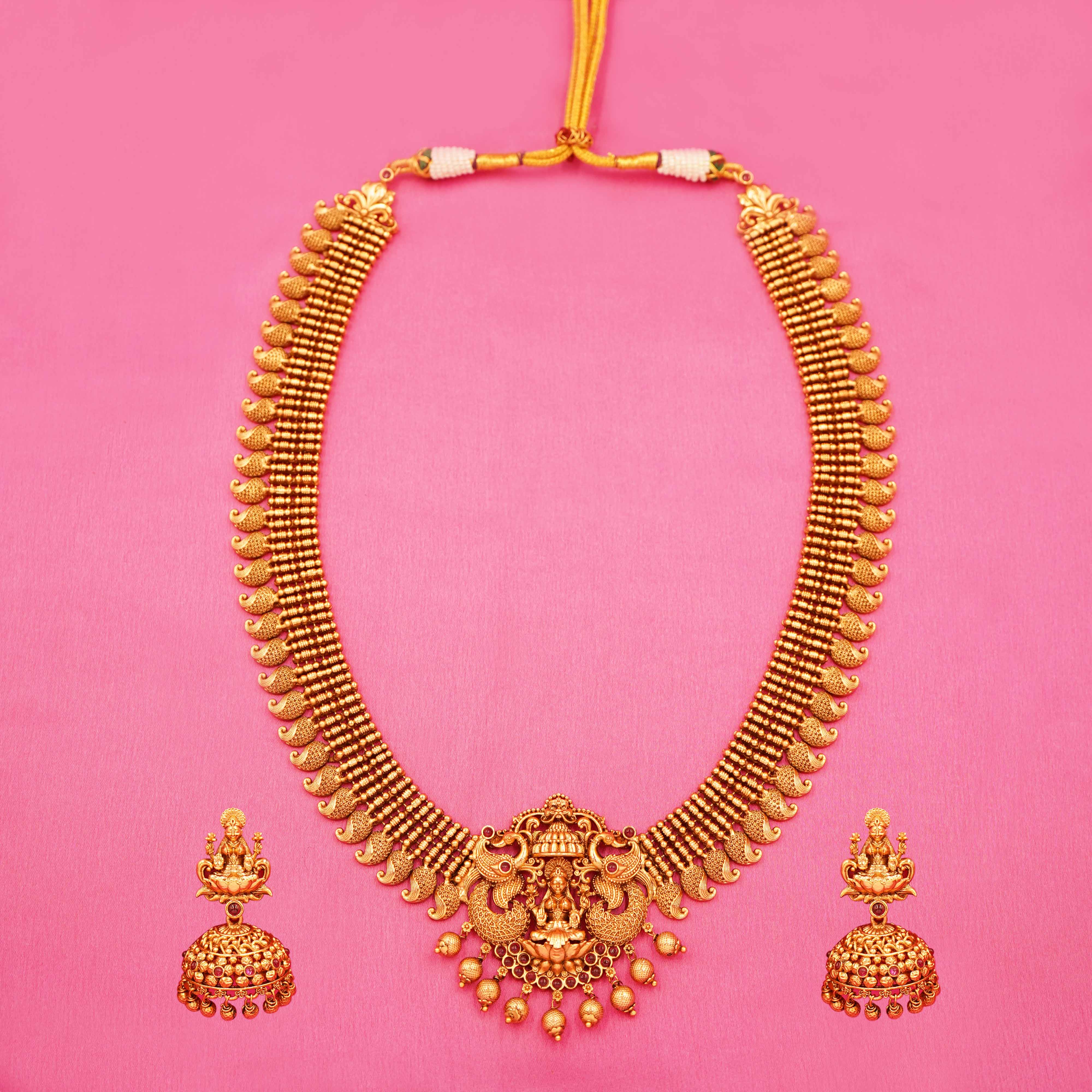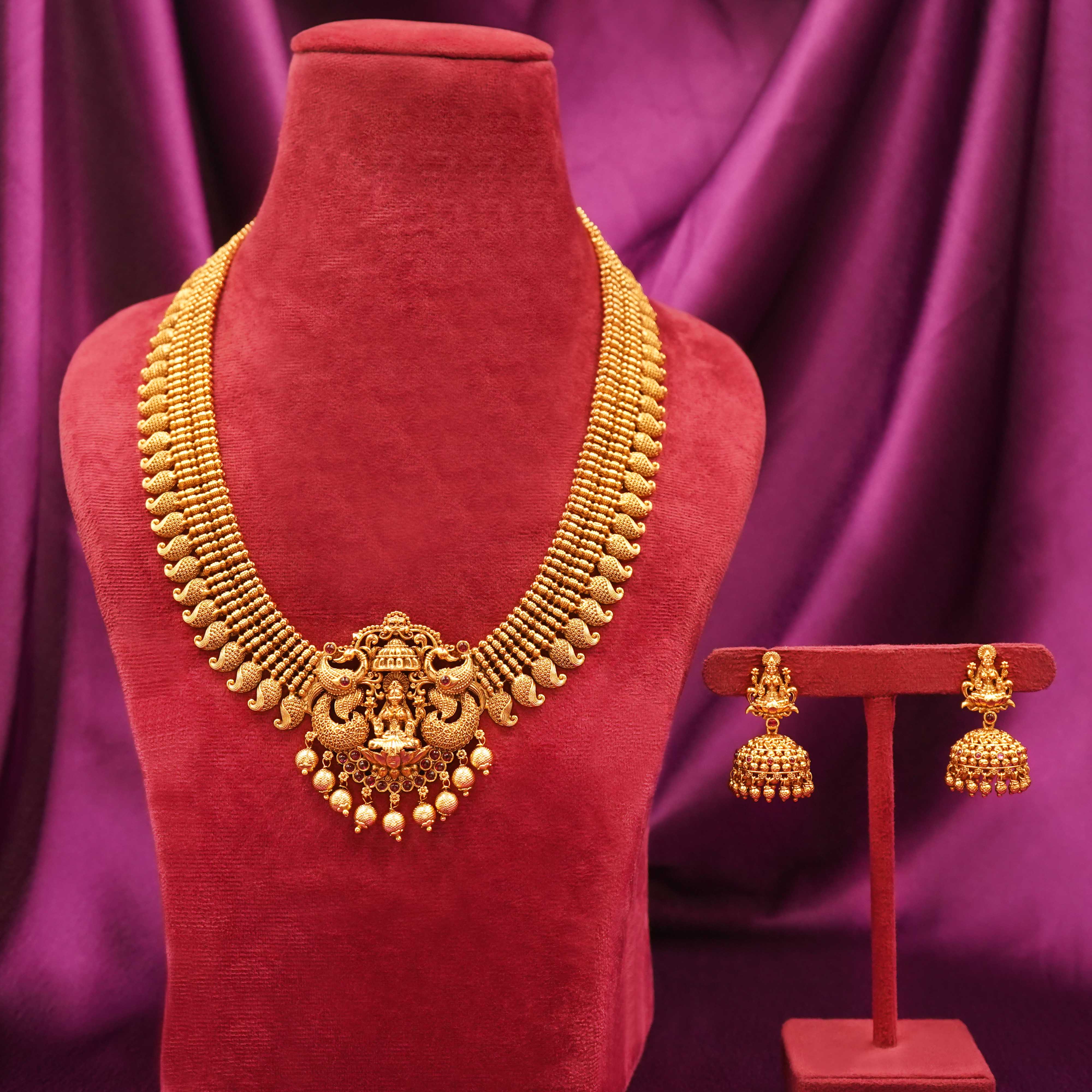 DESCRIPTION - LONG NECKLACE SET, TRADITIONAL SOUTH INDIAN GOLD-PLATED JEWELLERY SET, CONSISTING OF A LONG NECKLACE AND A PAIR OF MATCHING JHUMKA-STYLE EARRINGS. THE NECKLACE SHOWCASING A CENTRAL DEITY FIGURE FLANKED BY PEACOCKS, AND THE EARRINGS ALSO INCORPORATING DEITY FIGURES WITH DOME-SHAPED JHUMKAS ADORNED WITH SMALL DANGLING BEADS.