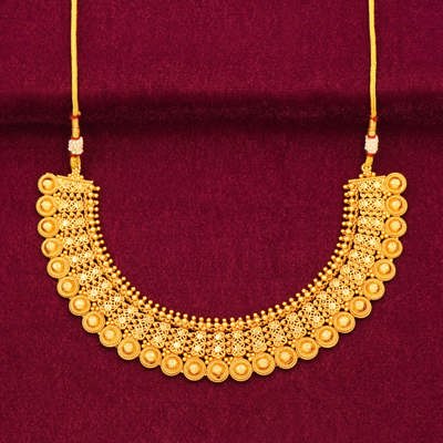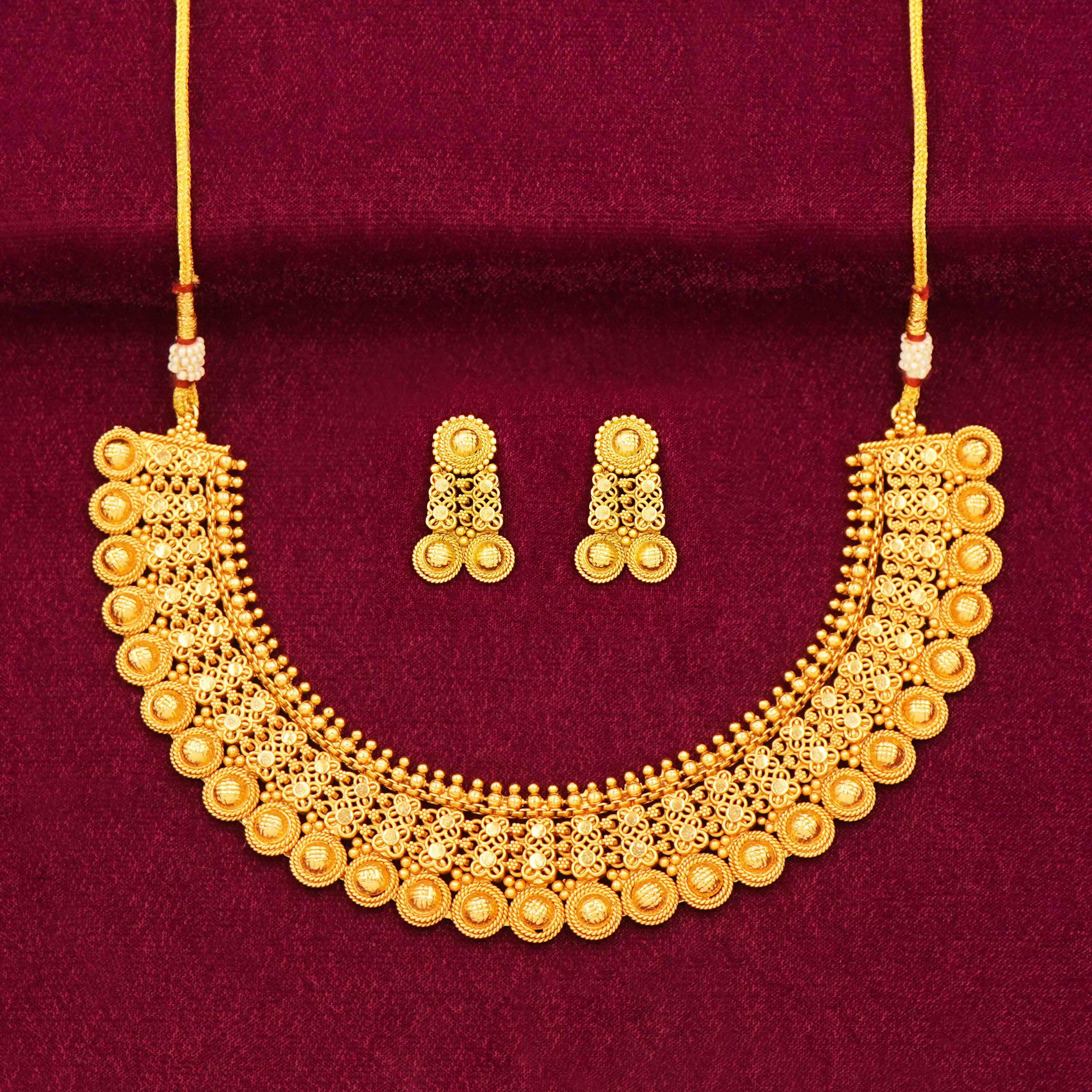 DESCRIPTION - CHOCKER SET/ SHORT NECKLACE SET, TRADITIONAL-STYLE NECKLACE AND MATCHING EARRINGS. THE NECKLACE SET DESIGN FEATURES DETAILED FILIGREE WORK, FLORAL MOTIFS, AND SYMMETRICAL PATTERNS COMMON IN INDIAN-BRIDAL AND CEREMONIAL JEWELRY. THE CRAFTSMANSHIP EMPHASIZES TEXTURE AND DEPTH WITH ORNATE DETAILING.