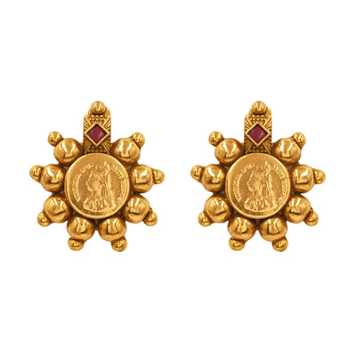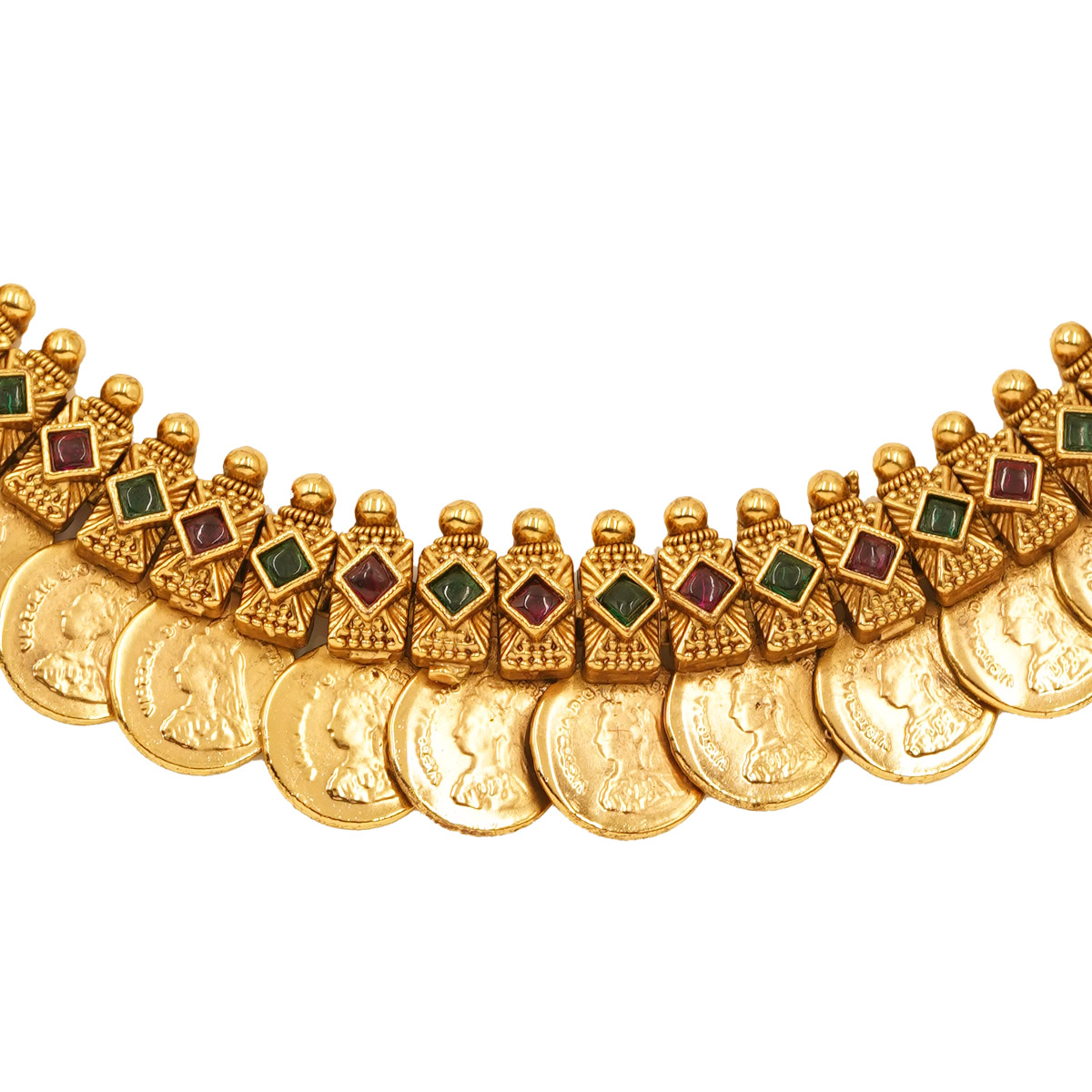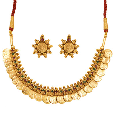 DESCRIPTION - This beautiful coin necklace set features antique-style golden detailing with red and green accents, inspired by traditional South Indian temple jewelry. perfect for festive occasions, weddings, and cultural celebrations. Elegant, lightweight, and full of ethnic charm, this set adds a royal touch to your traditional outfit.