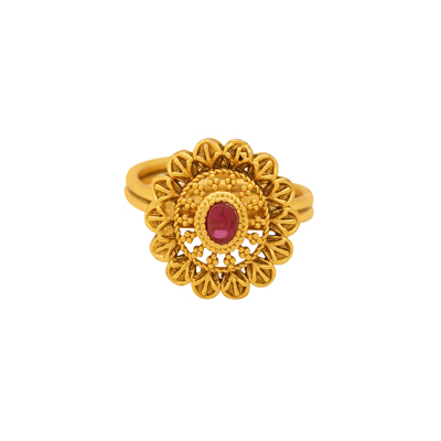 DESCRIPTION - THE ITEM PICTURED IS A TRADITIONAL INDIAN COCKTAIL RING THAT PROMINENTLY FEATURES INTRICATE GOLD TONE FILIGREE WORK AND A CENTRAL RED GEMSTONE, LIKELY A RUBY OR A SIMULANT SUCH AS CUBIC ZIRCONIA (CZ). THE DESIGN IS ORNATE AND OFTEN DESCRIBED AS A FLORAL OR UMBRELLA MOTIF, INTENDED TO MAKE A BOLD STATEMENT FOR SPECIAL OCCASIONS OR TRADITIONAL CELEBRATIONS