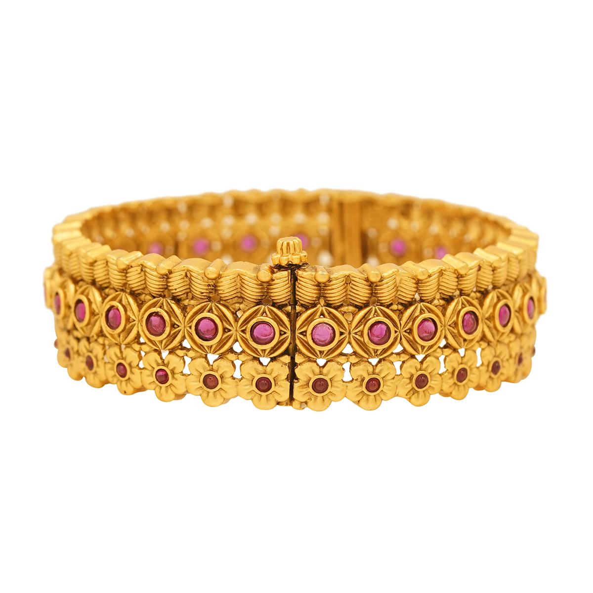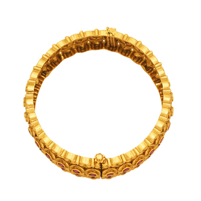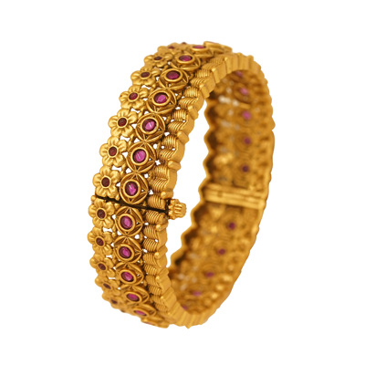 DESCRIPTION - THE BANGLES FEATURING AN INTRICATE TRADITIONAL INDIAN DESIGN. THEY HAVE AN ANTIQUE OR MATTE FINISH AND ARE EMBELLISHED WITH SMALL RED STONES, LIKELY RUBIES OR RUBY-COLORED CUBIC ZIRCONIA (CZ). THE DESIGN INCORPORATES DETAILED FLORAL.