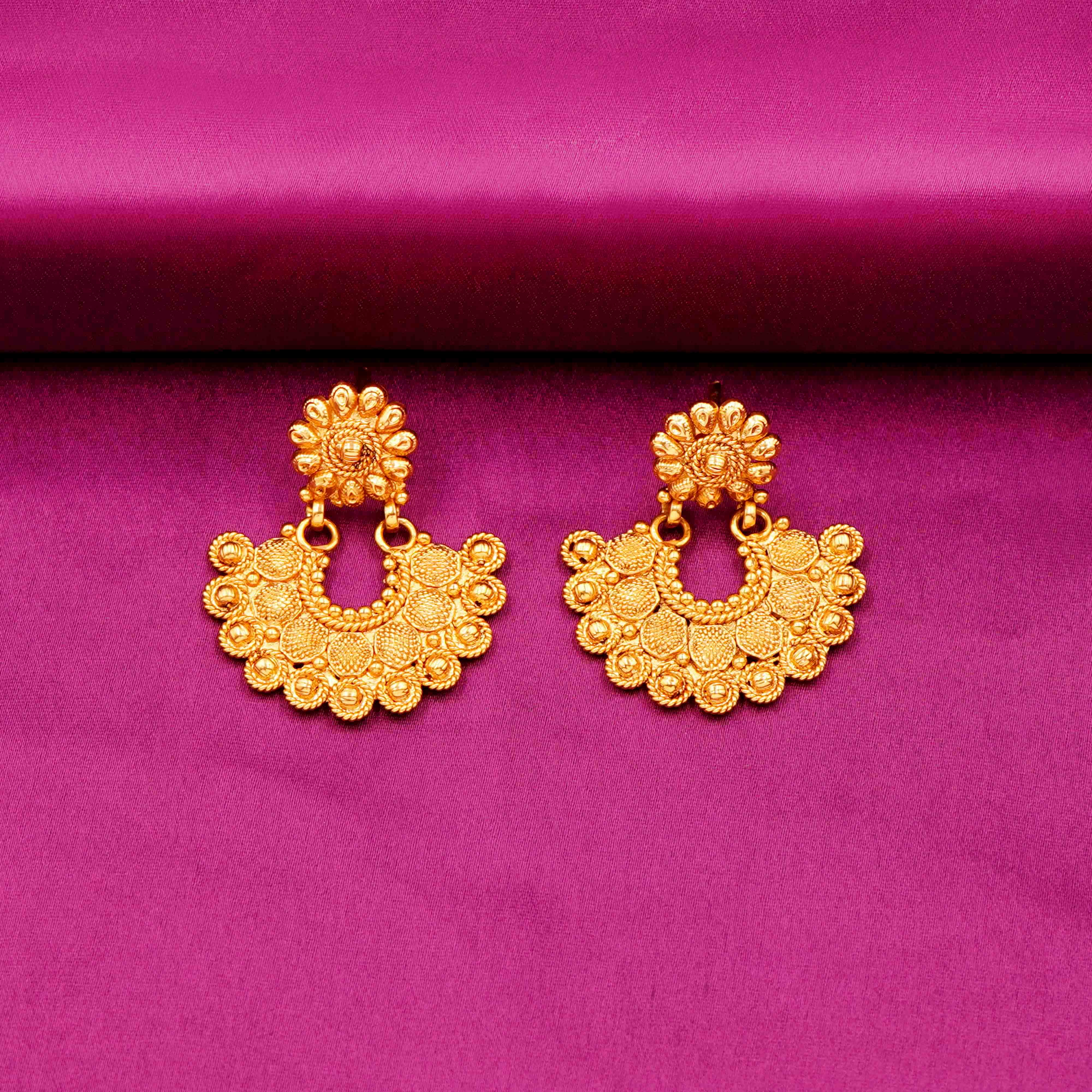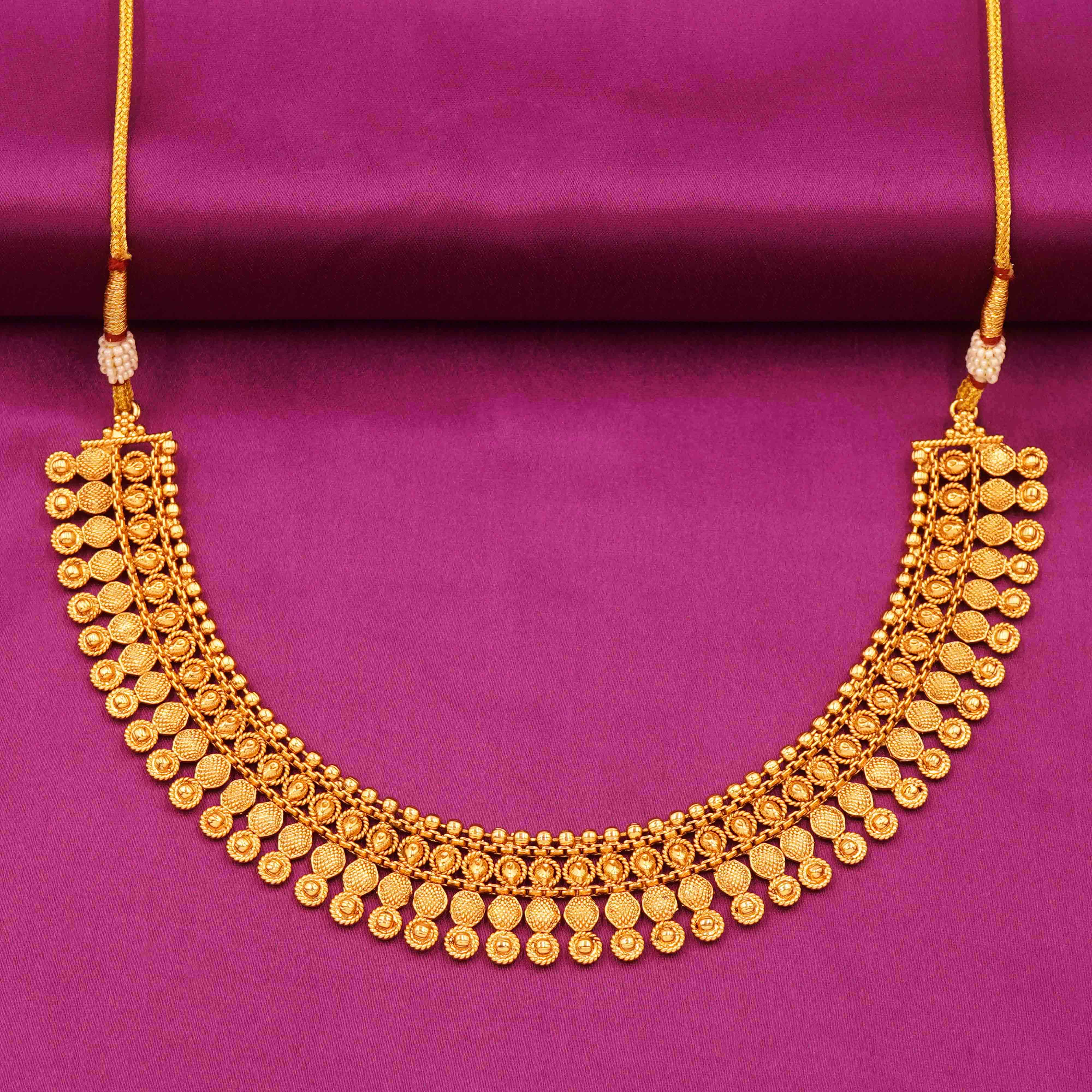 DESCRIPTION - A classic wedding set with ornate detailing and traditional motifs. NECKLACE SET/CHOCKER, TRADITIONAL INDIAN NECKLACE SET CONSISTING OF A GOLD-TONED NECKLACE AND MATCHING EARRINGS. IT REFLECTS A CLASSIC ETHNIC STYLE OFTEN SEEN IN TEMPLE OR BRIDAL JEWELRY. Ideal for weddings and cultural events, with layered necklaces and jhumka earrings